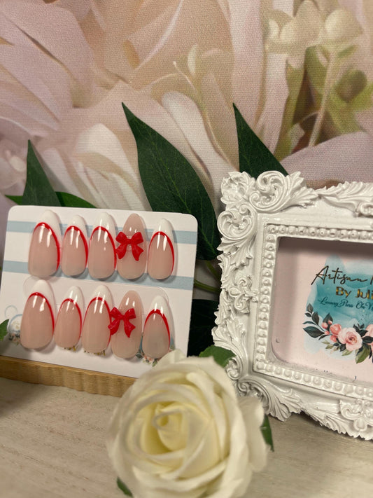 RED RIBBONS - Set of red Lined French tip nails with red bow