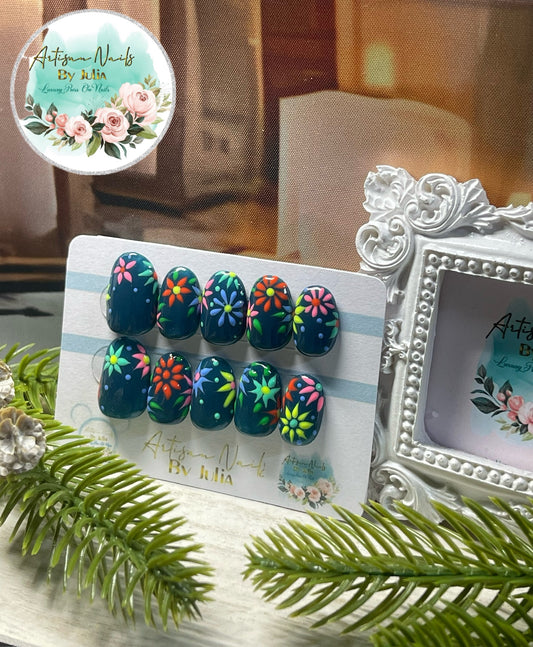 COCO -Set of 10 Teal Nails with Neon Flowers