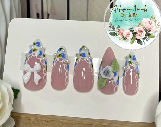 ROSEBUD BLUE - Set of 10 French Tip Nails with Blue Roses & Pearls