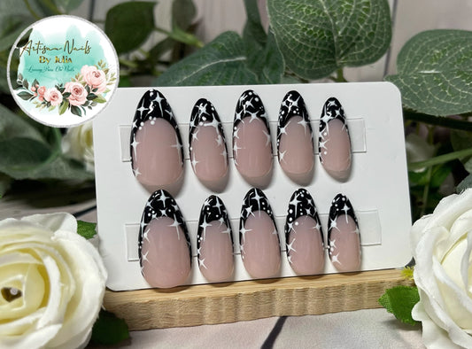 CLEAR SKIES - Set of 10 Black French Tip Nails with Stars