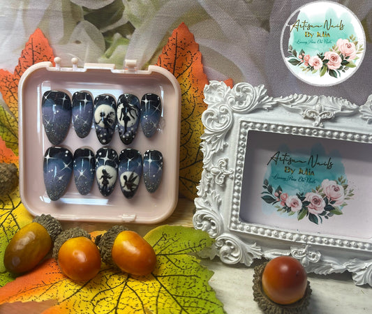 TWILIGHT - Uñas de gel prensadas - Set de 10 uñas de medianoche con detalles de hadas