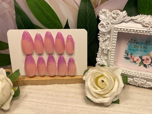 Deja que tu poder brille: juego de 10 uñas con efecto ombré morado y hoja de oro.