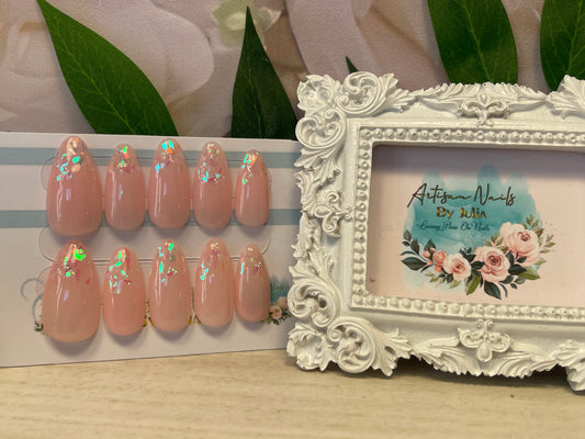 SUNSET SHARDS - Juego de 10 uñas de gel rosa con puntas de fragmentos de ópalo