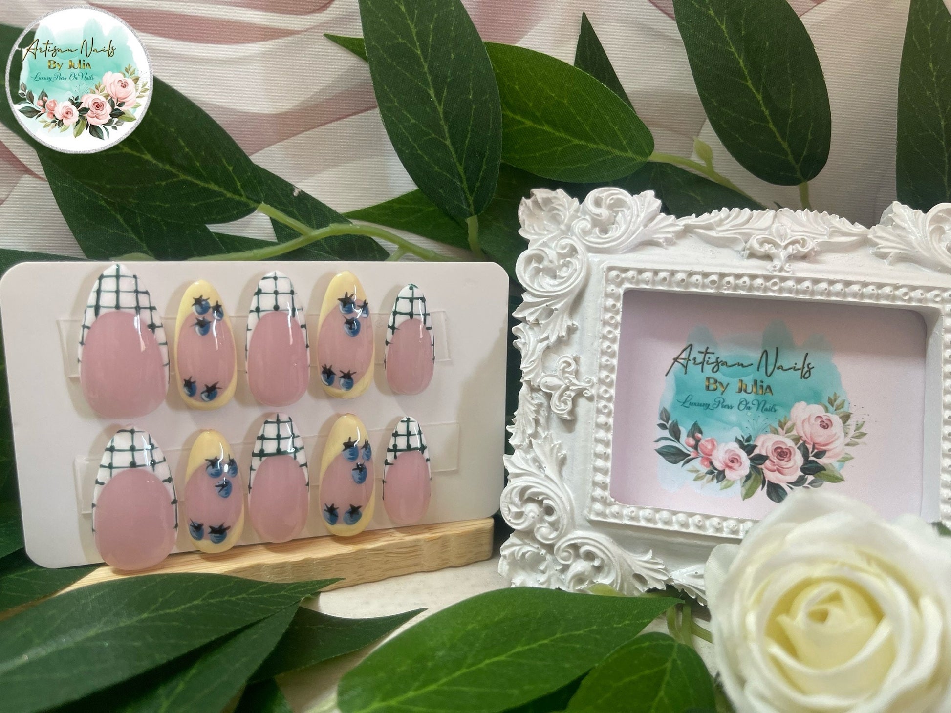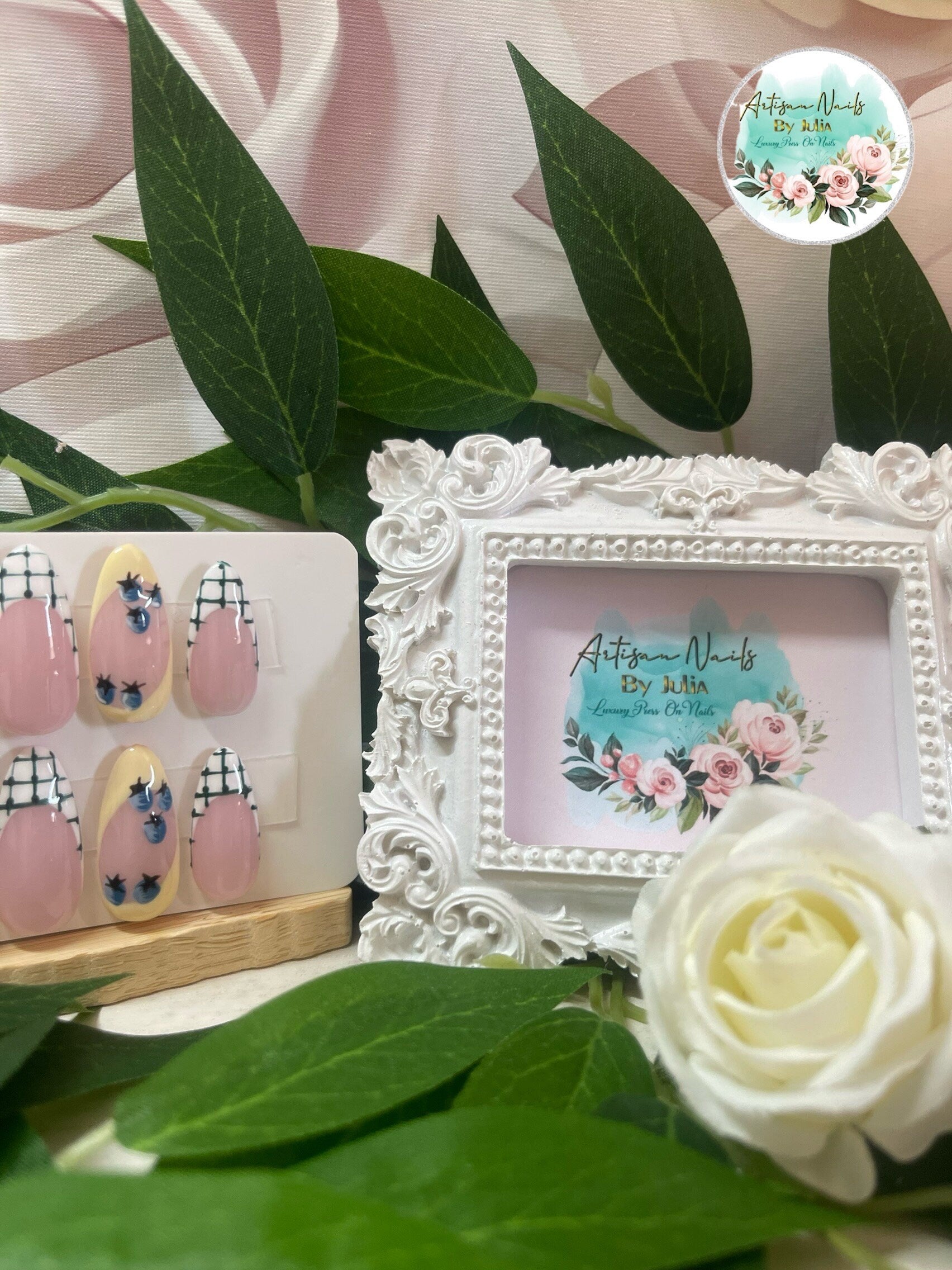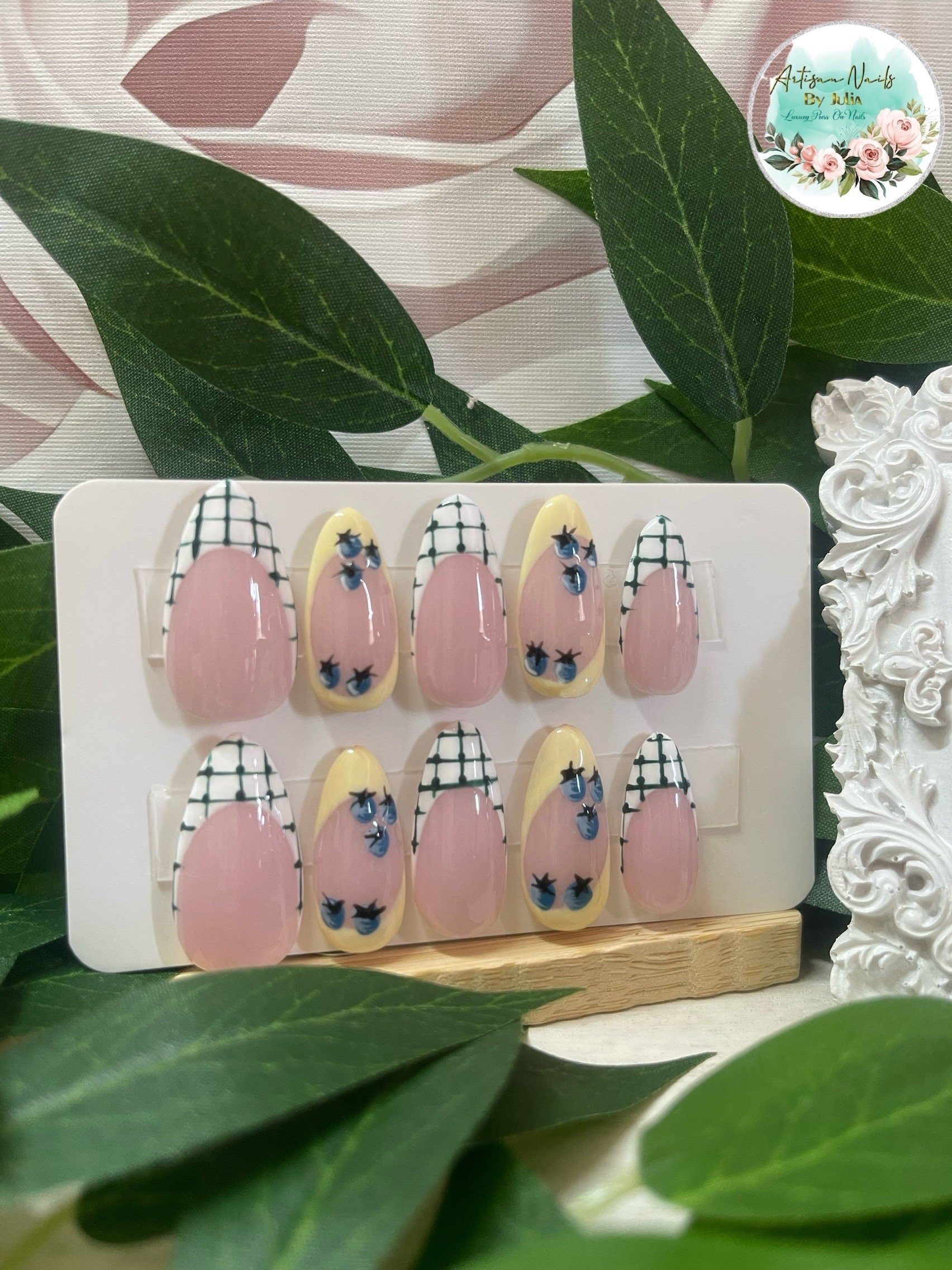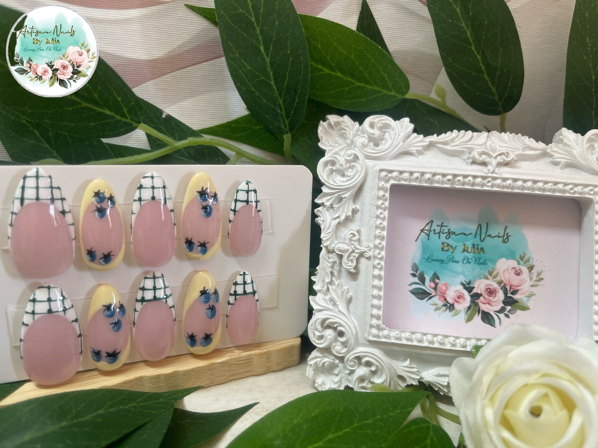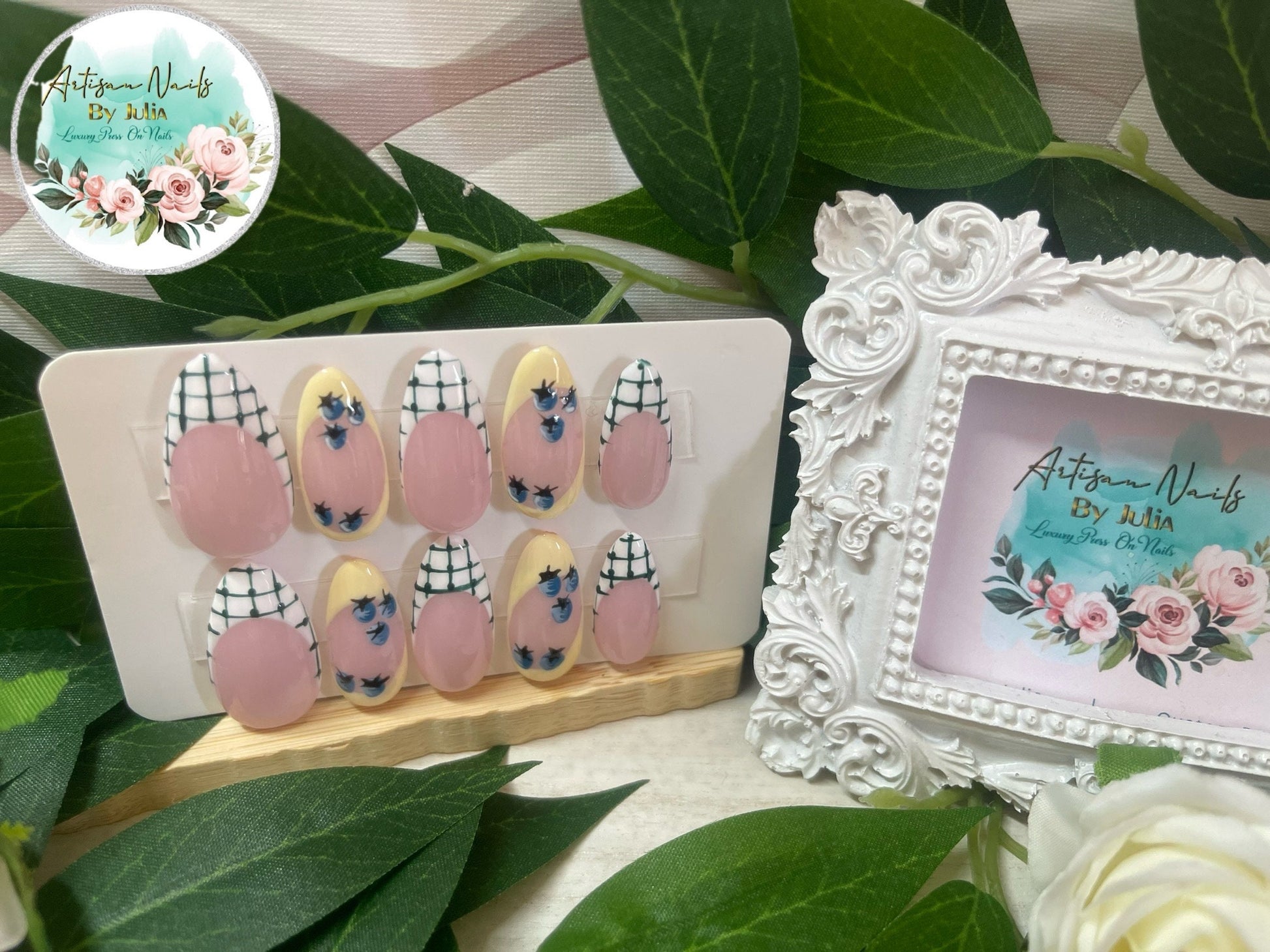 VIBRAS DE CABAÑA - Juego de 10 uñas de cuadros vichy en tonos arándano