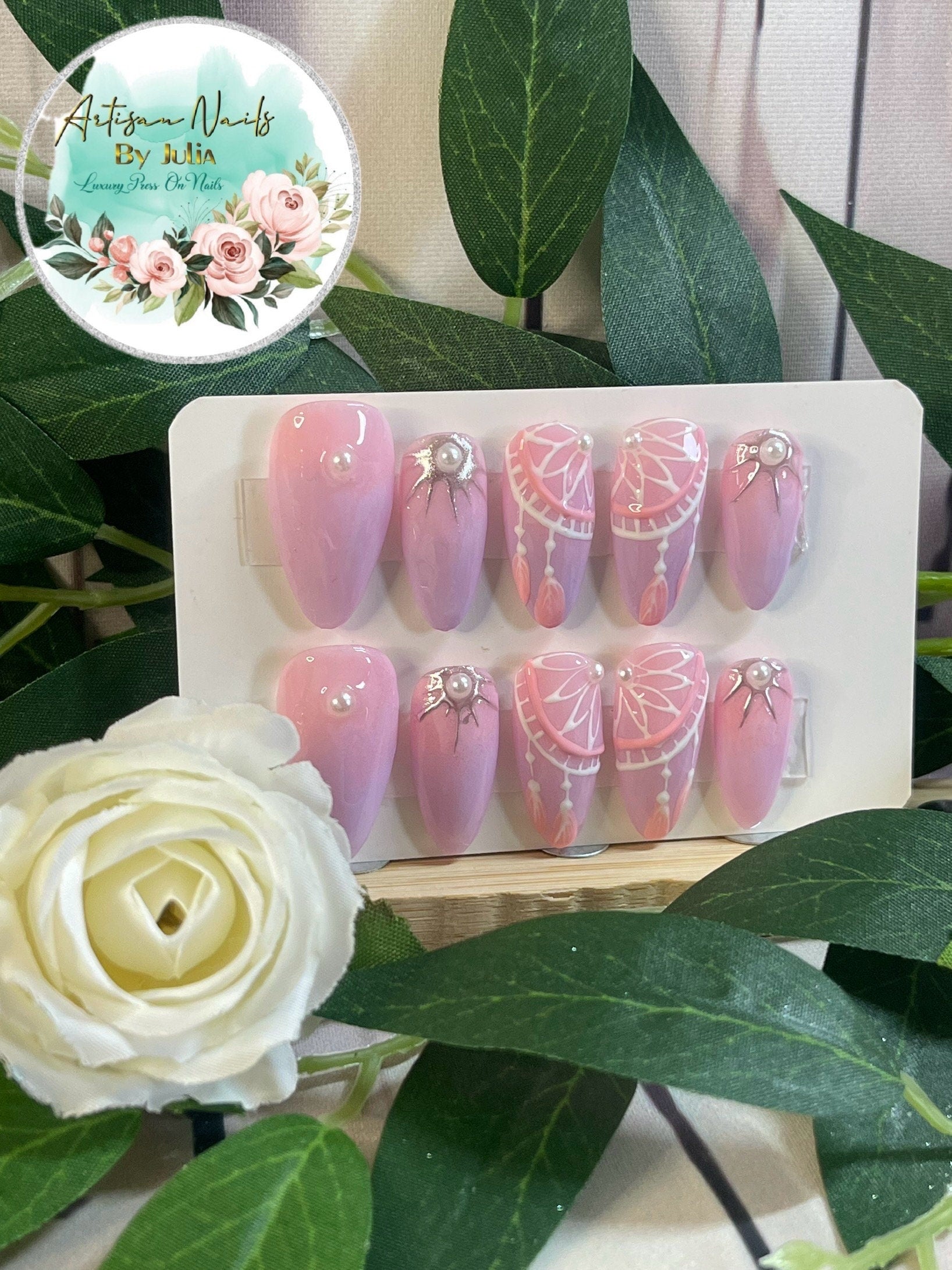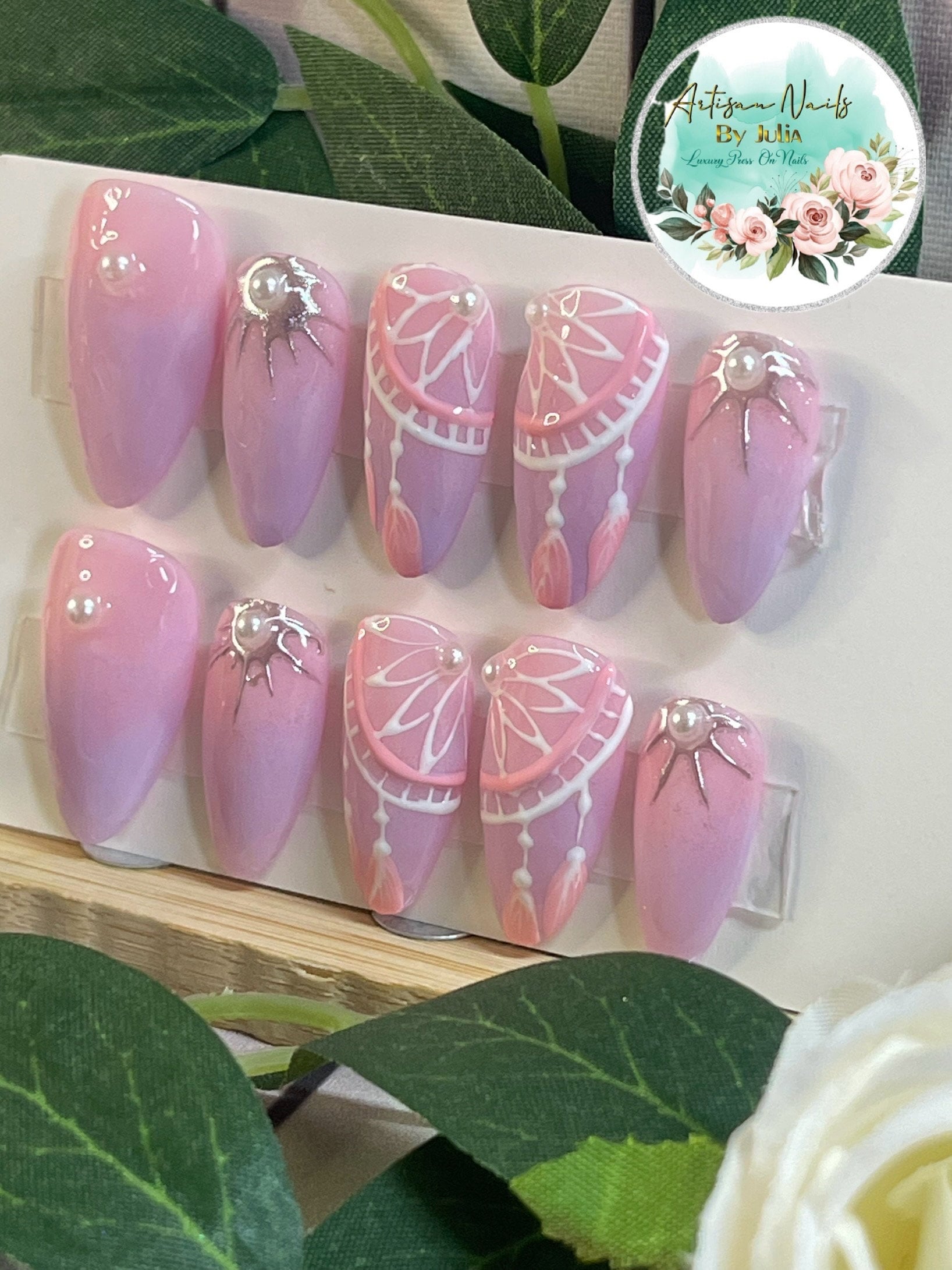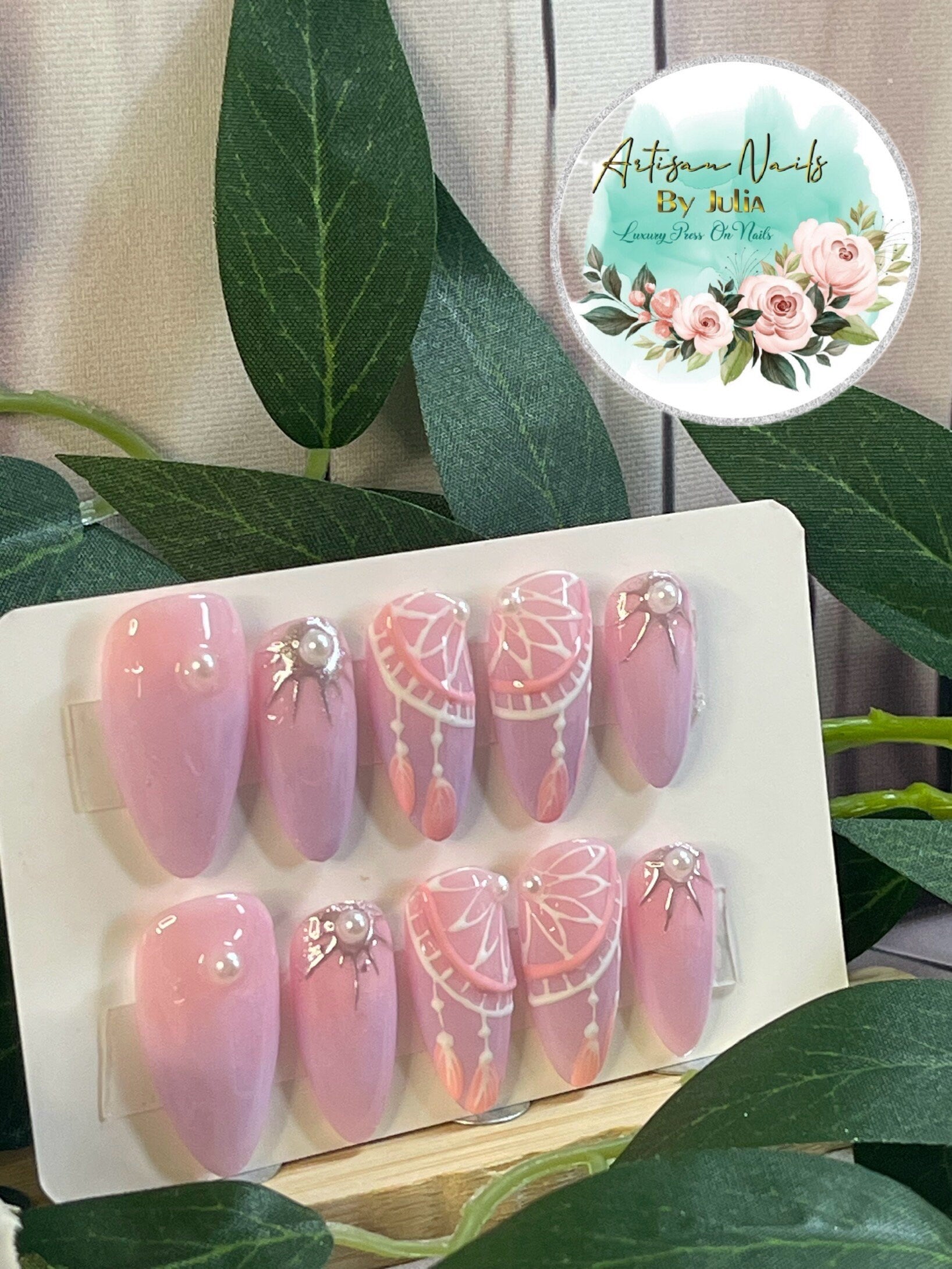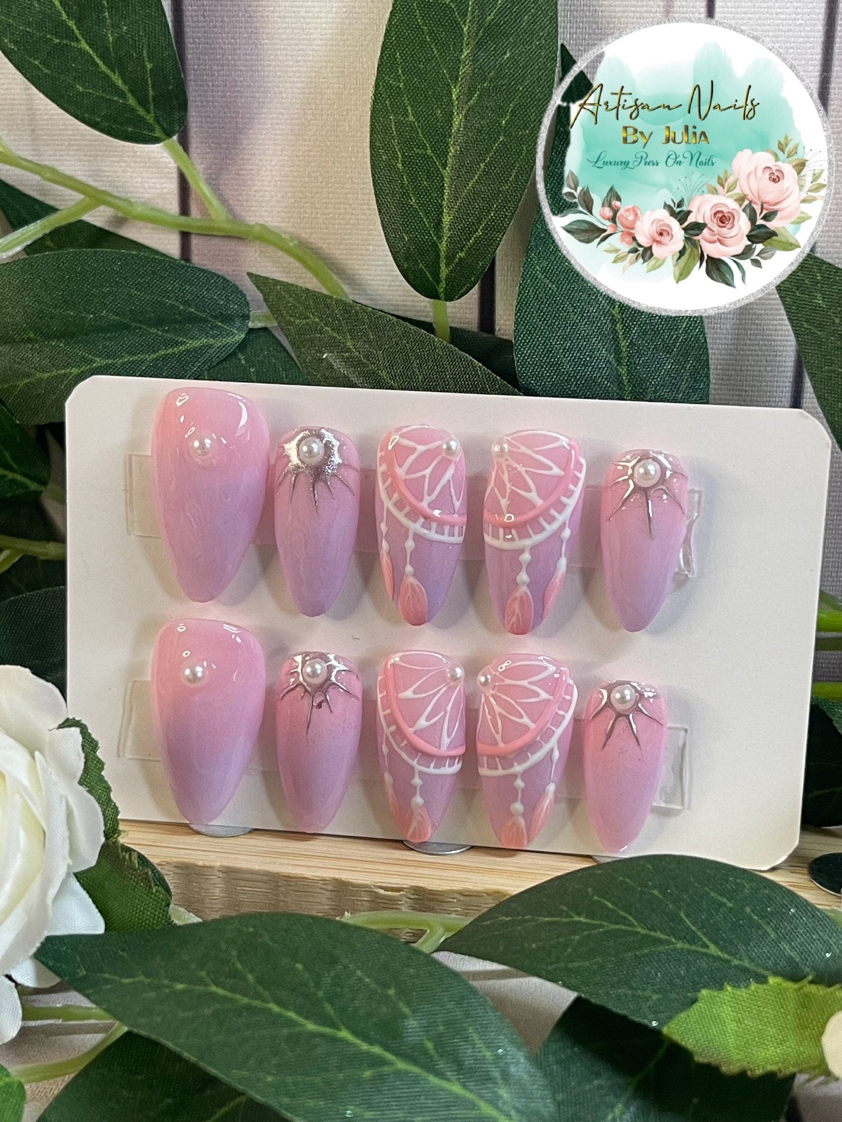 DREAMCATCHER - Juego de 10 uñas con diseño de atrapasueños en tonos perlados.