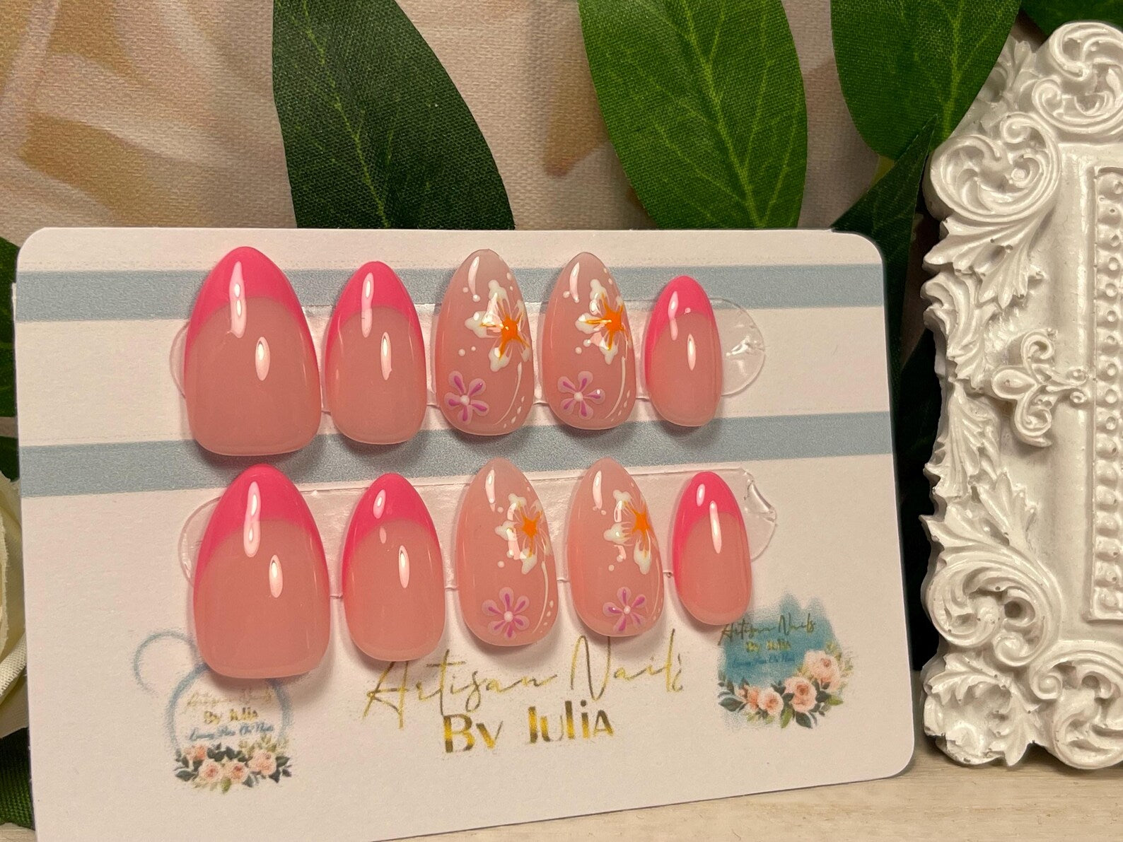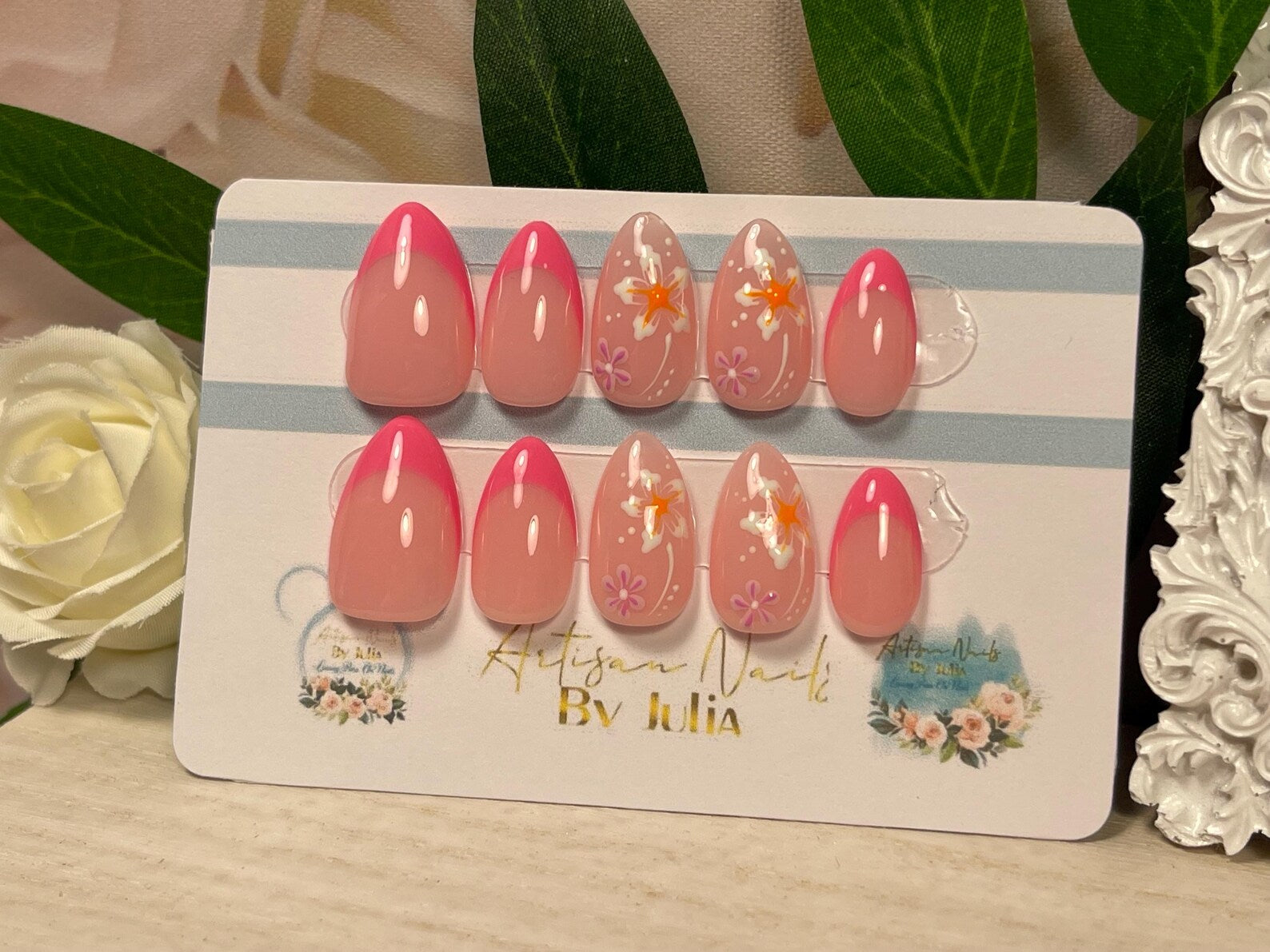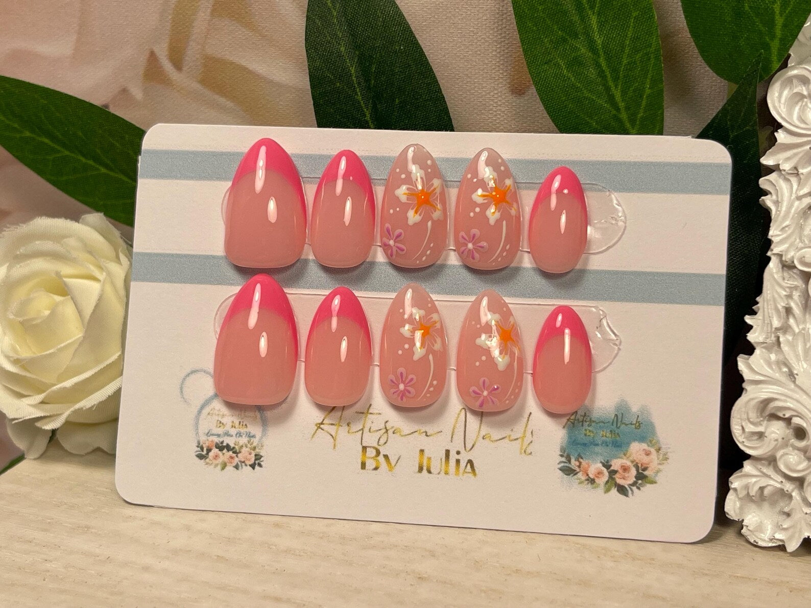 HIBISCO - Juego de 10 uñas francesas en rosa intenso con flores