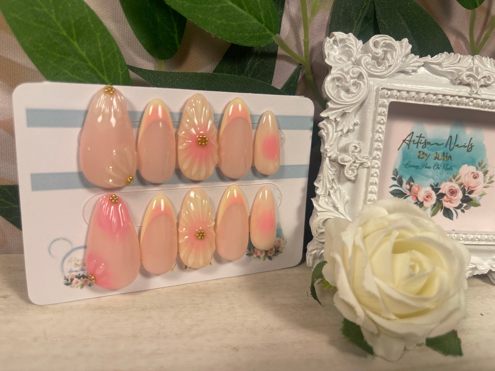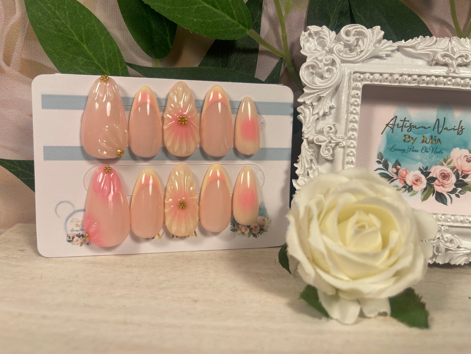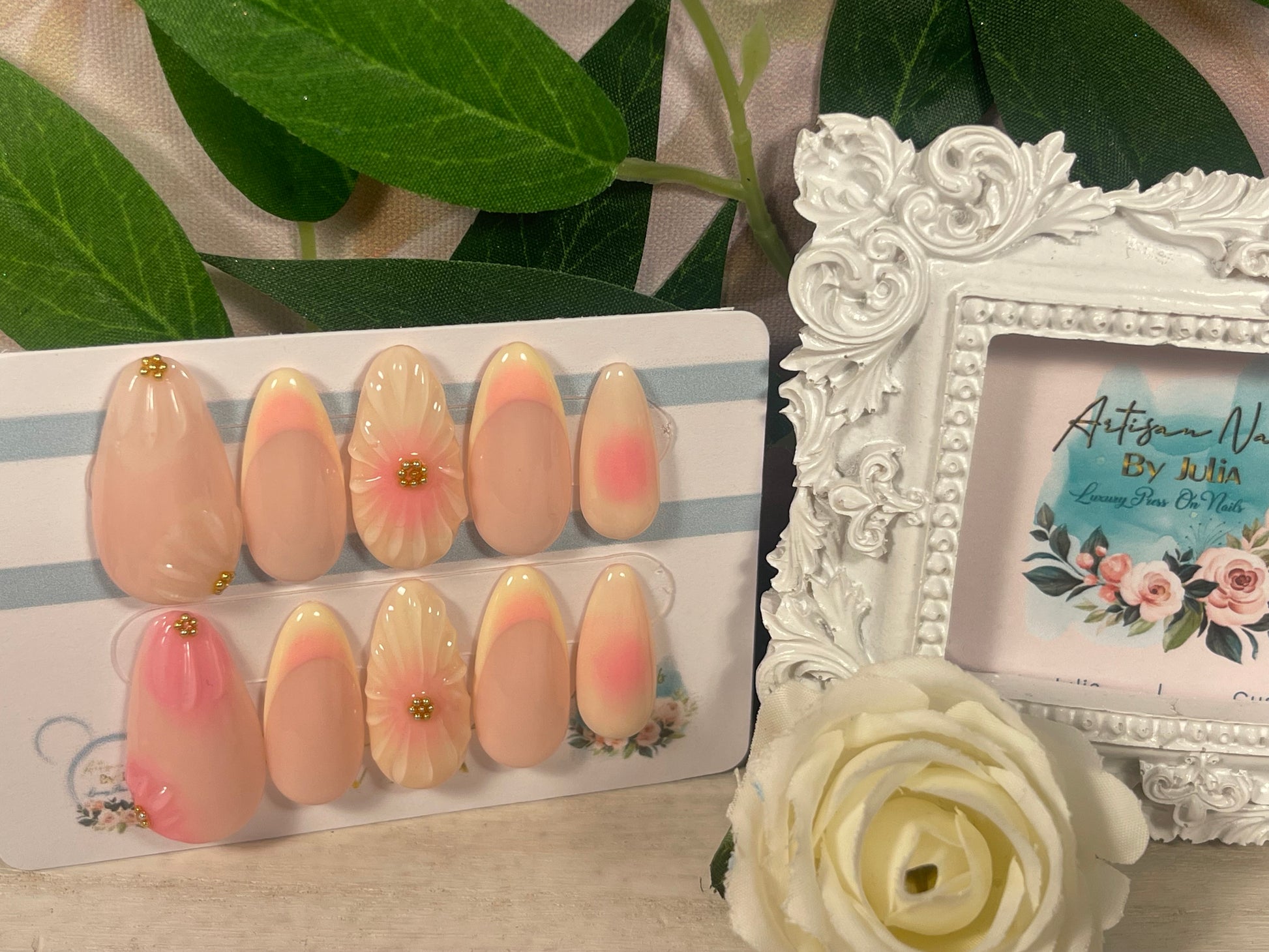 🌿Ten en cuenta que los colores pueden variar según la pantalla. Los diseños pueden presentar ligeras variaciones, ya que cada set se fabrica por encargo y se pinta a mano. Si necesitas ayuda, contáctame en info@artisannailsbyjulia.com .