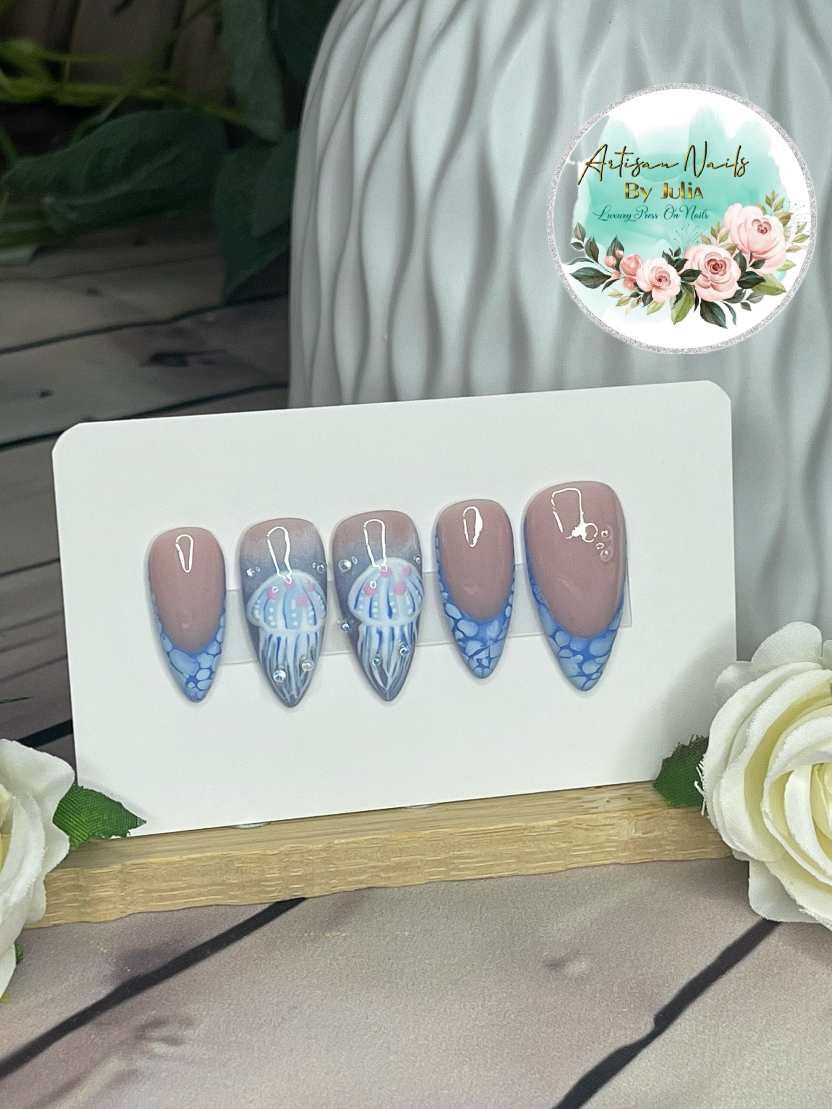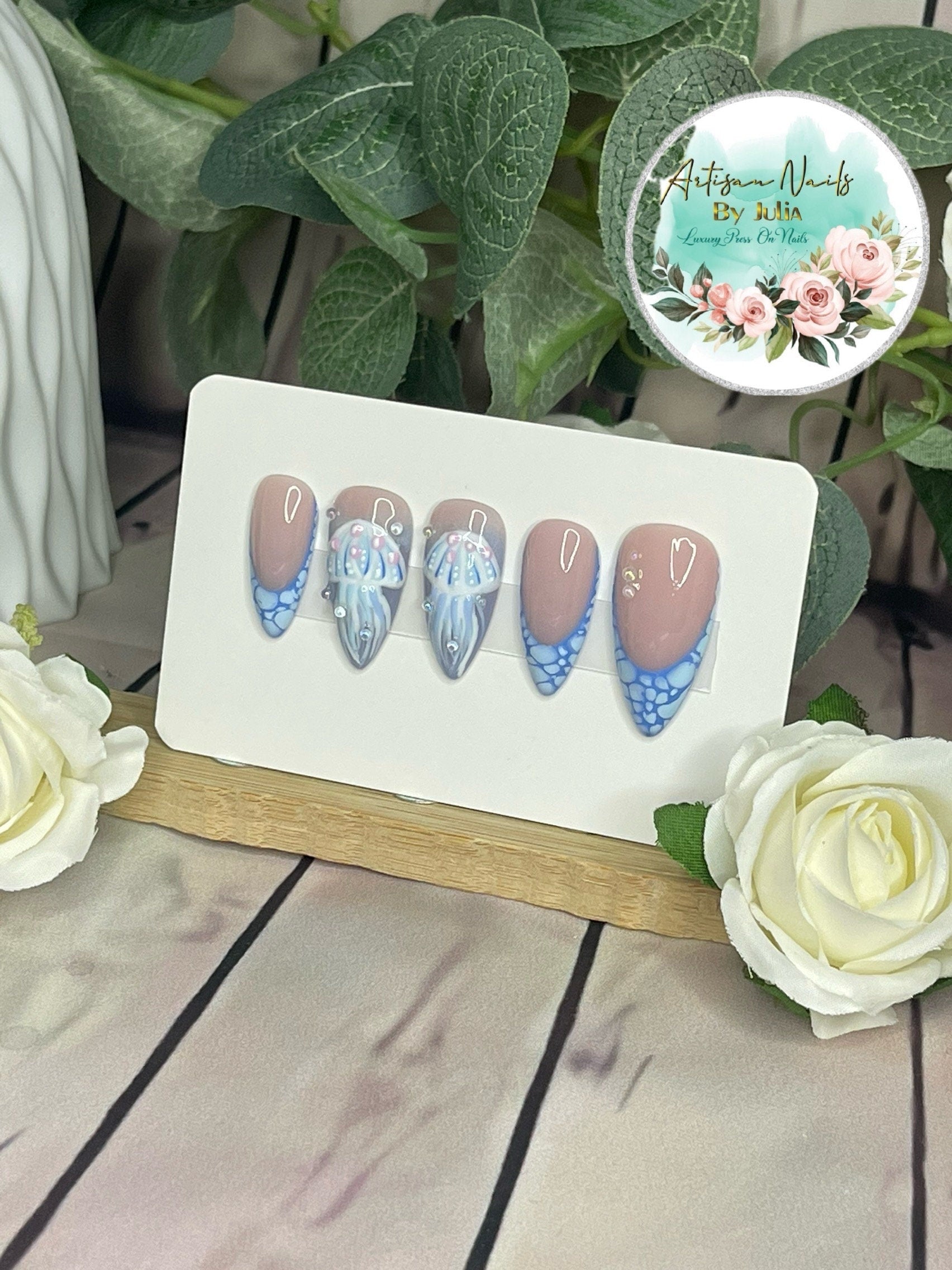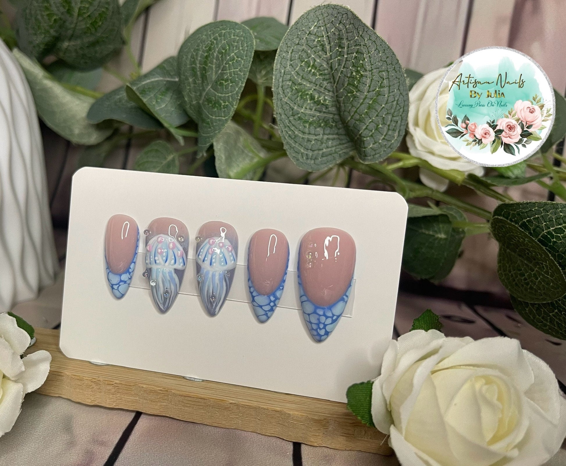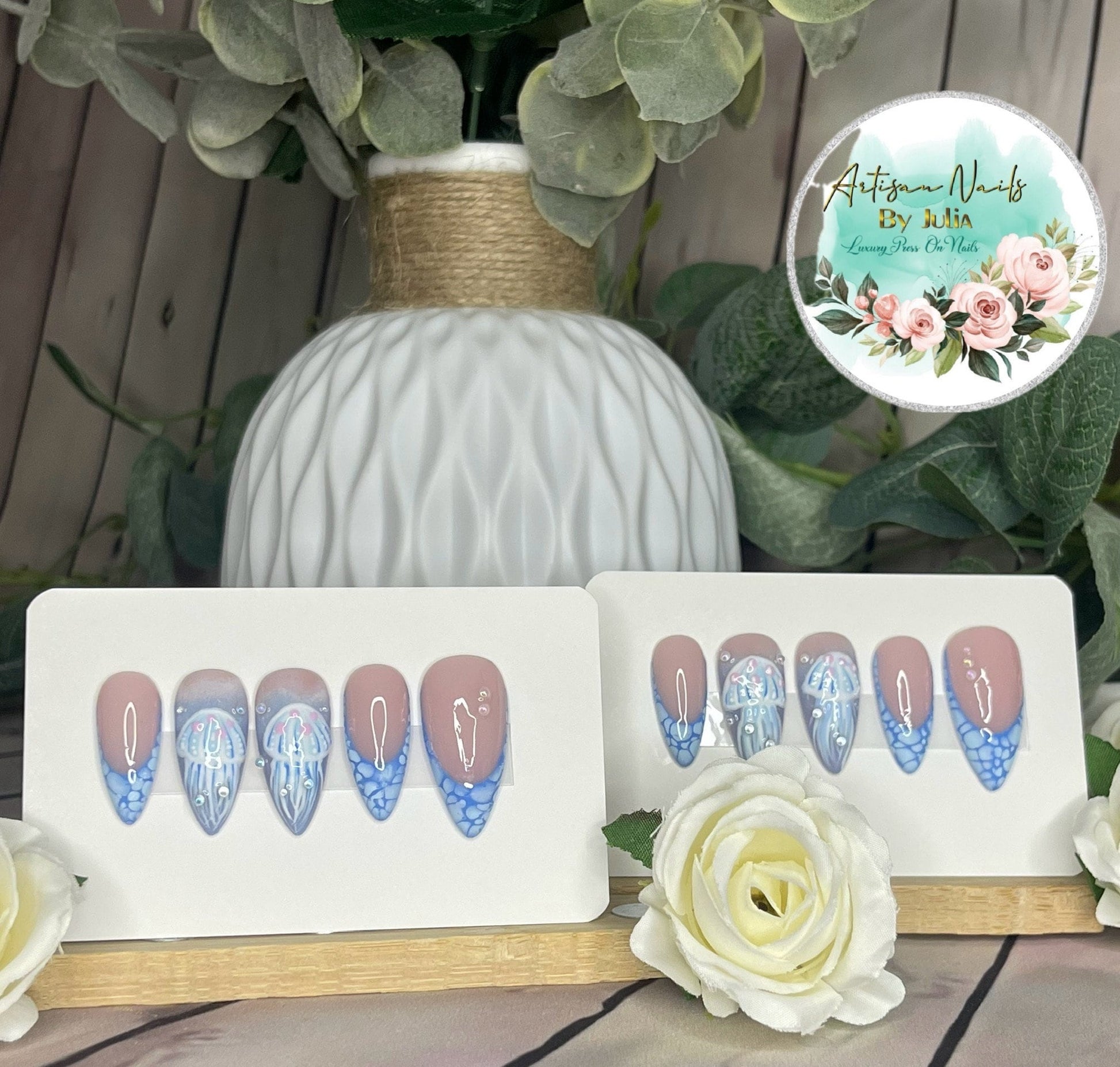 JELLYFISH - Juego de 10 uñas con punta francesa oceánica y medusas