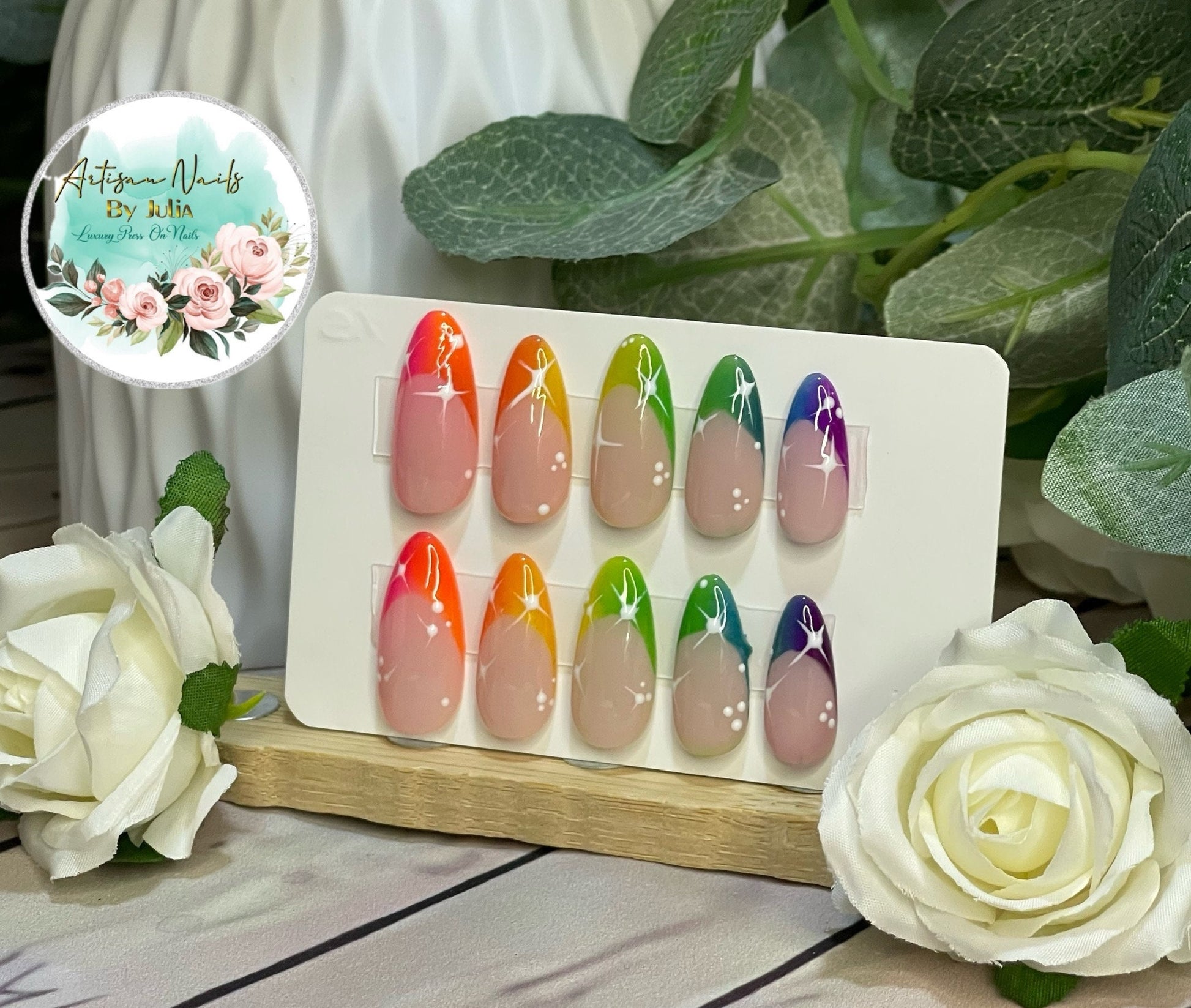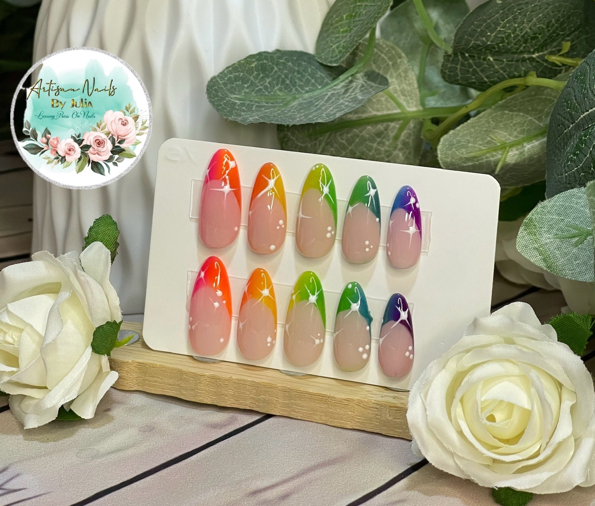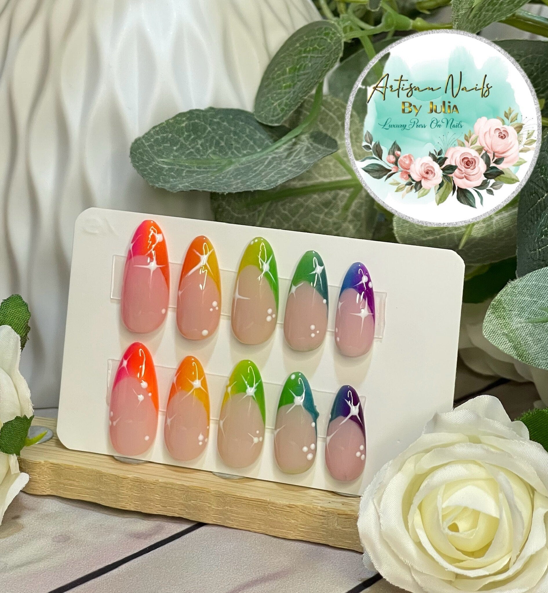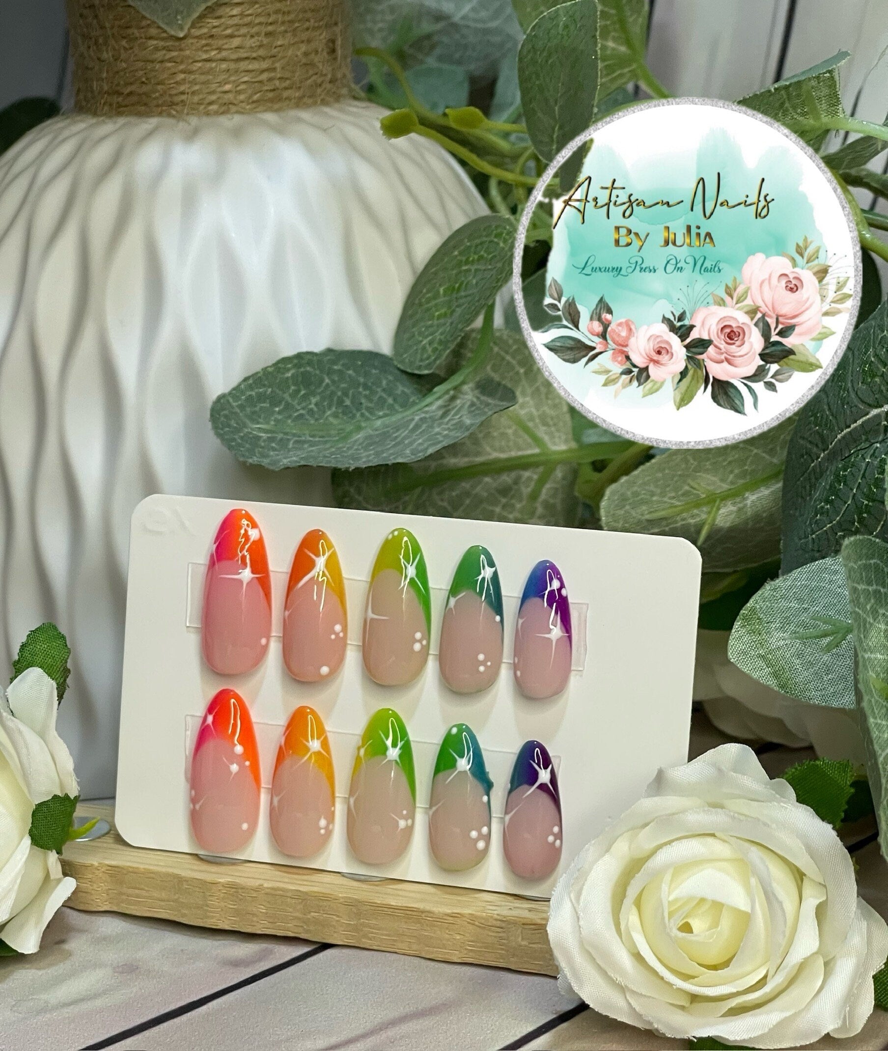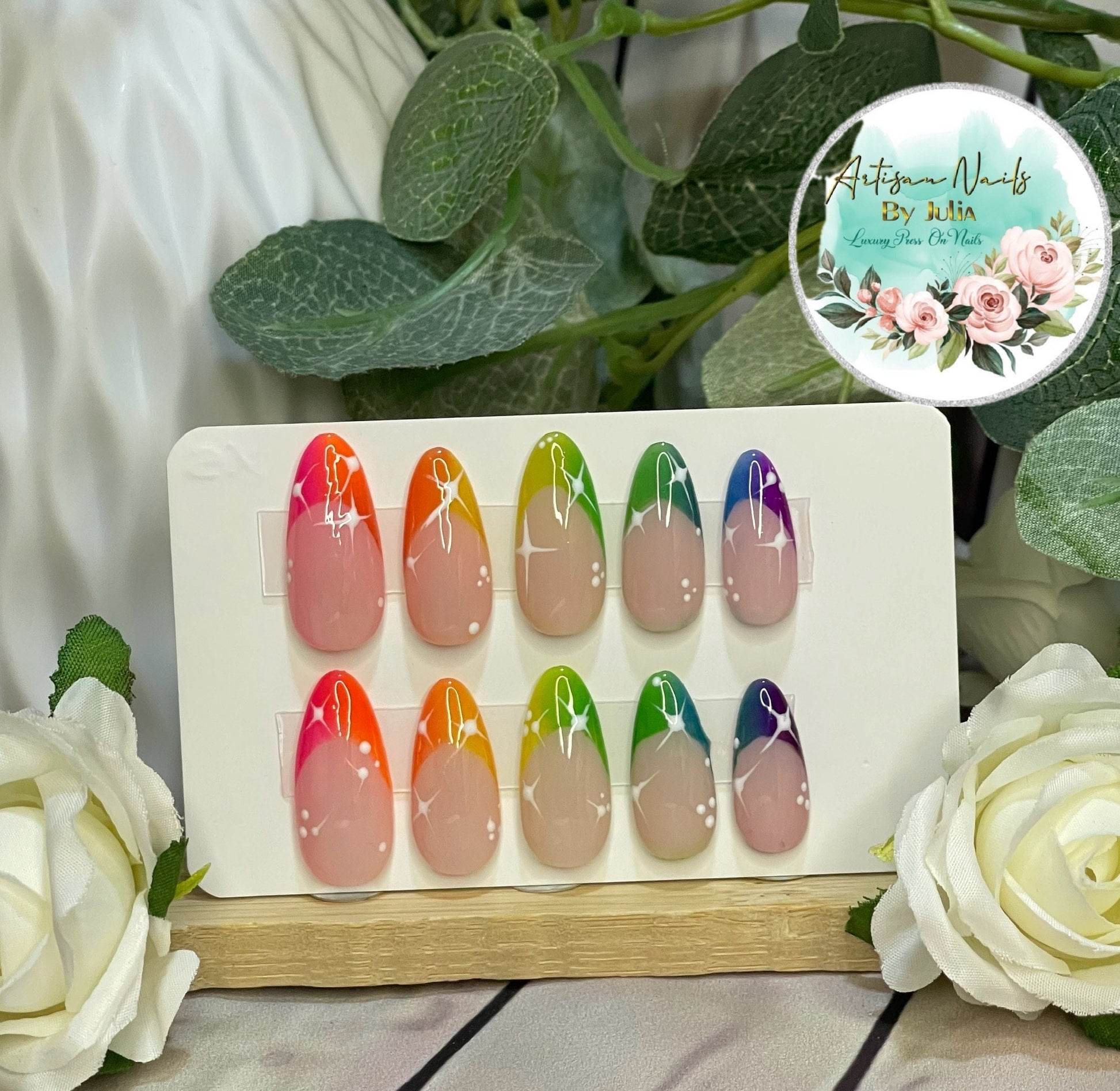 NEON SKIES - Juego de 10 uñas con punta francesa ombré arcoíris y estrellas blancas.