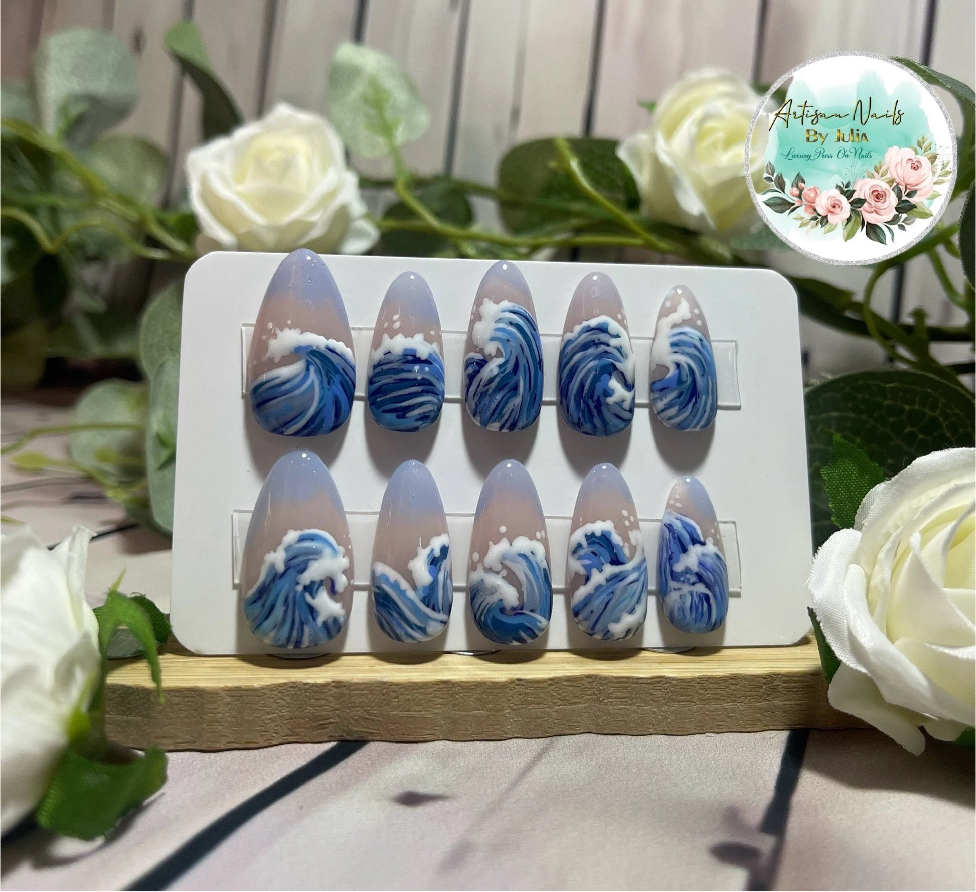 POLZEATH - Juego de 10 uñas con diseño de olas del océano y mar tormentoso