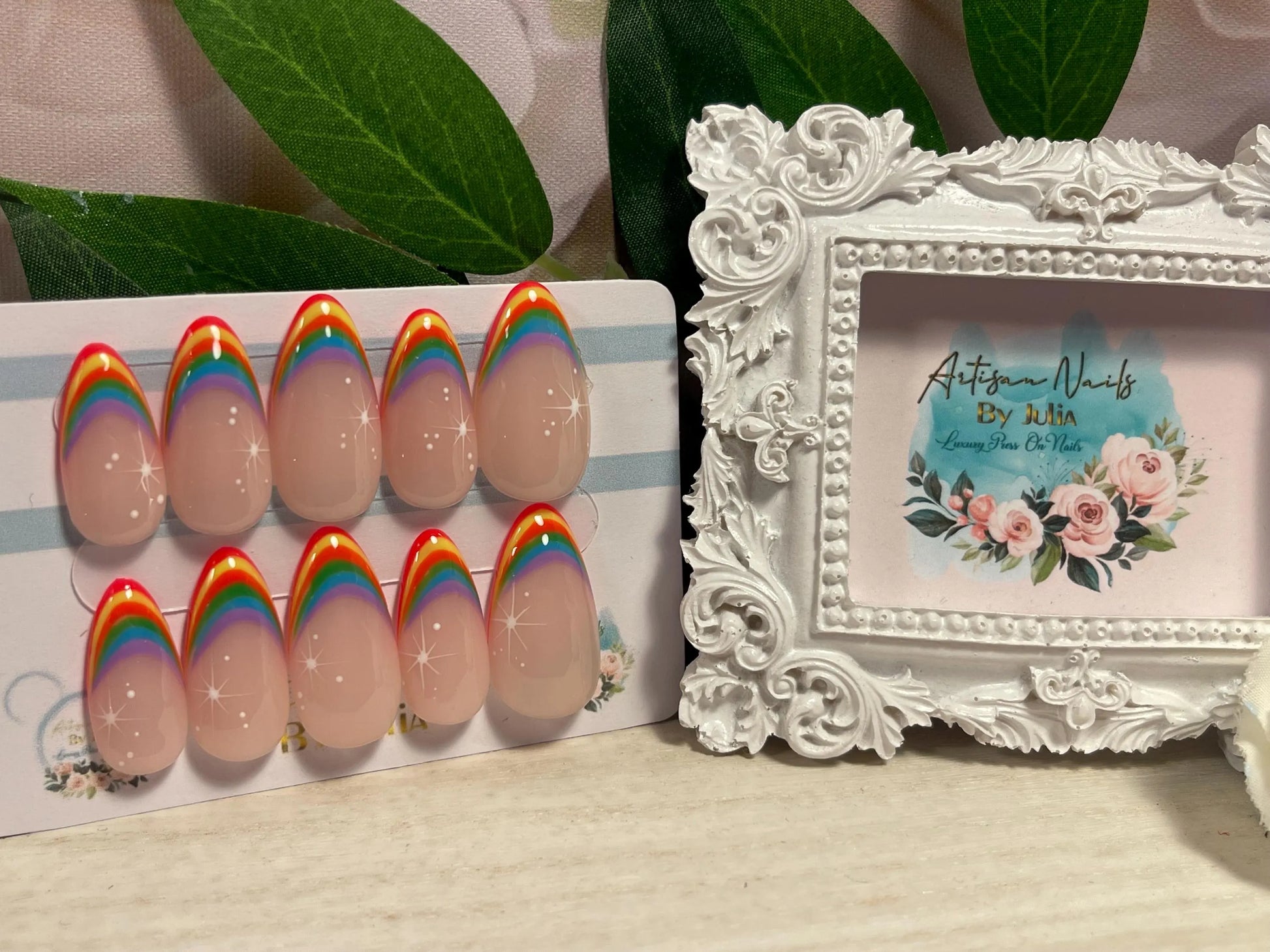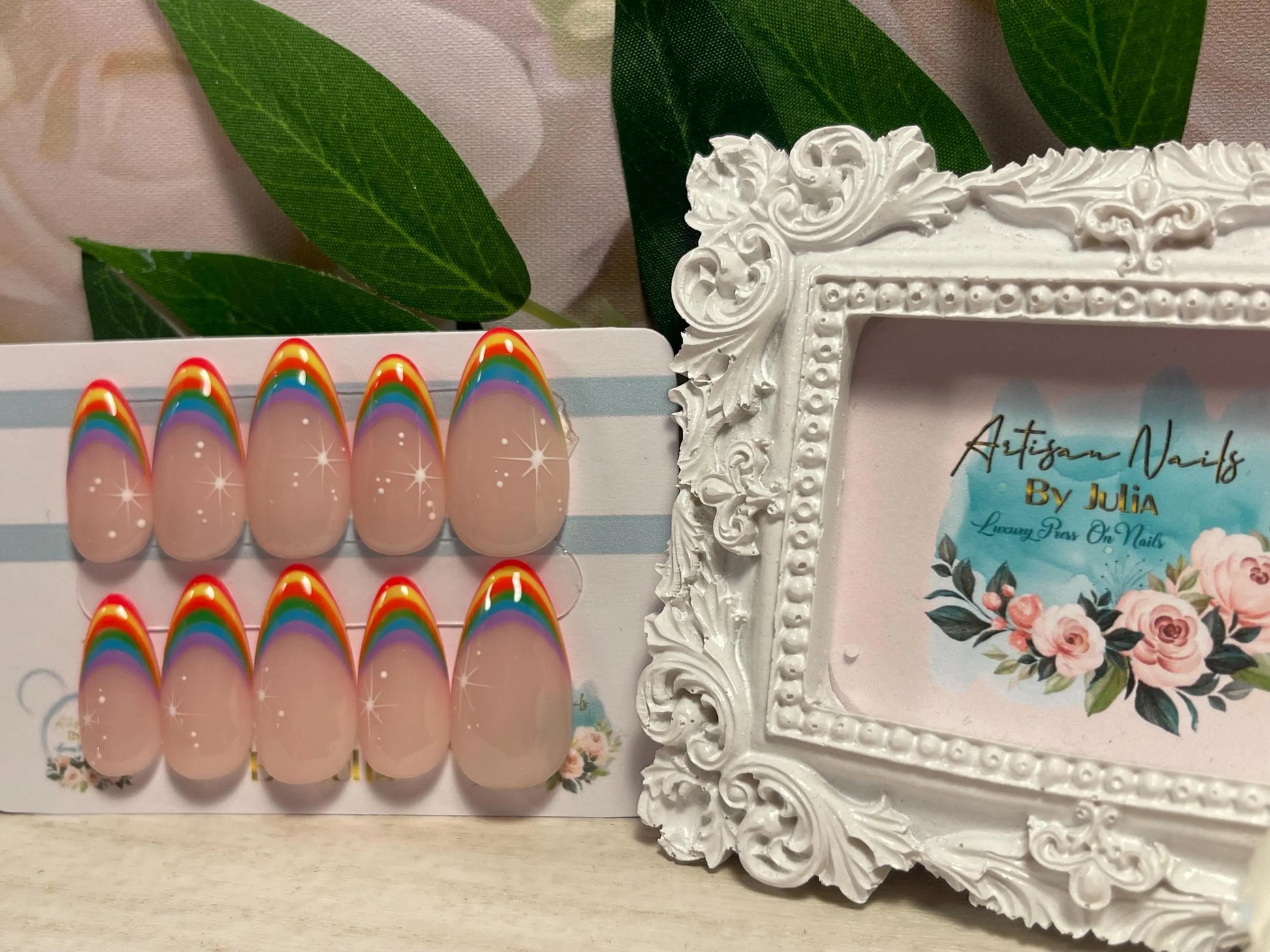 ARCOÍRIS BRILLANTE - Juego de 10 uñas francesas con punta de arcoíris y estrellas
