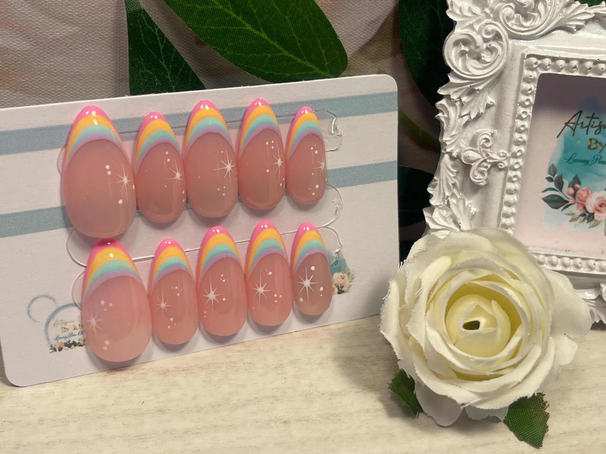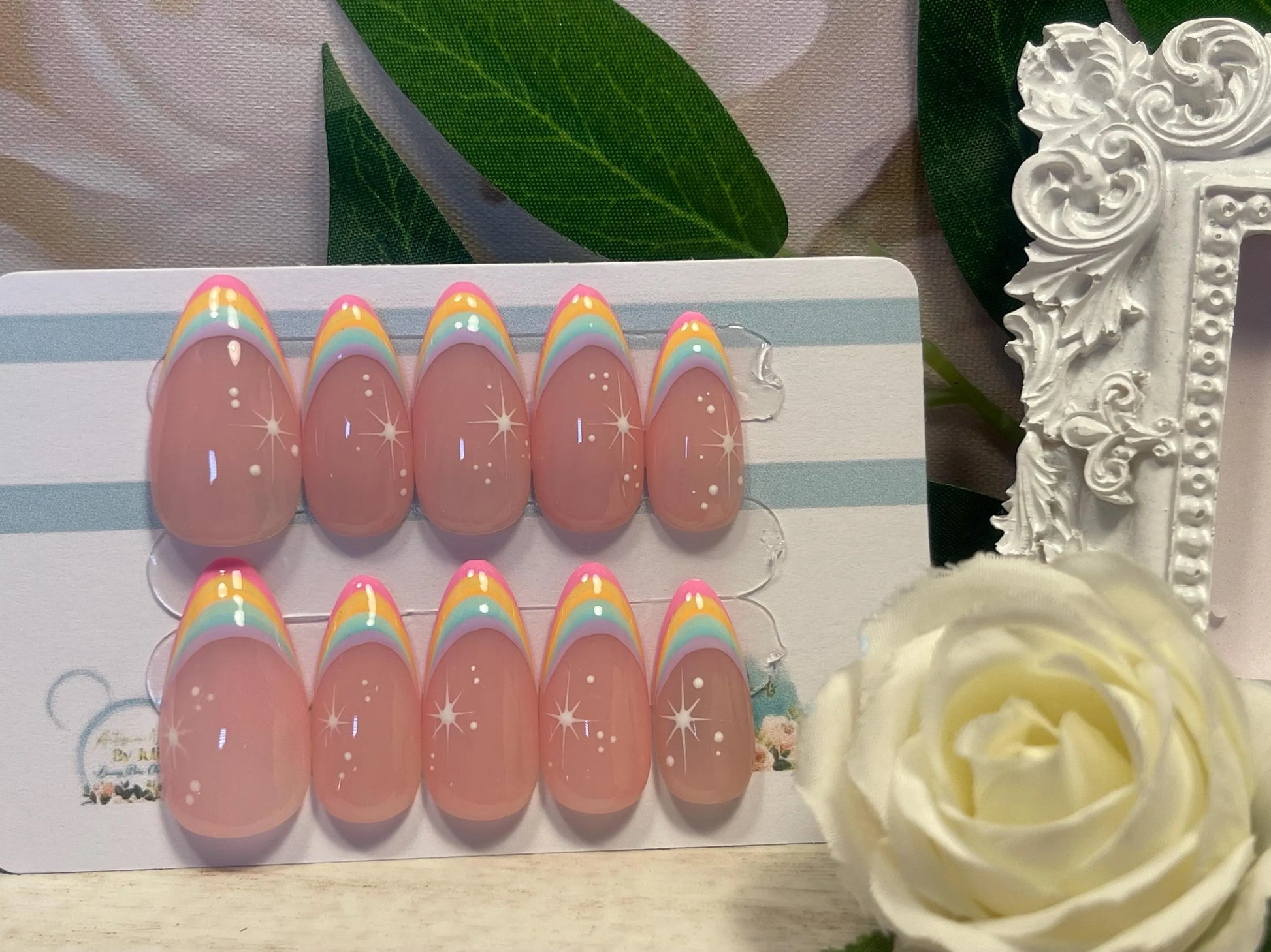 RAINBOW LIGHT - Juego de 10 uñas francesas con punta de arcoíris pastel y estrellas