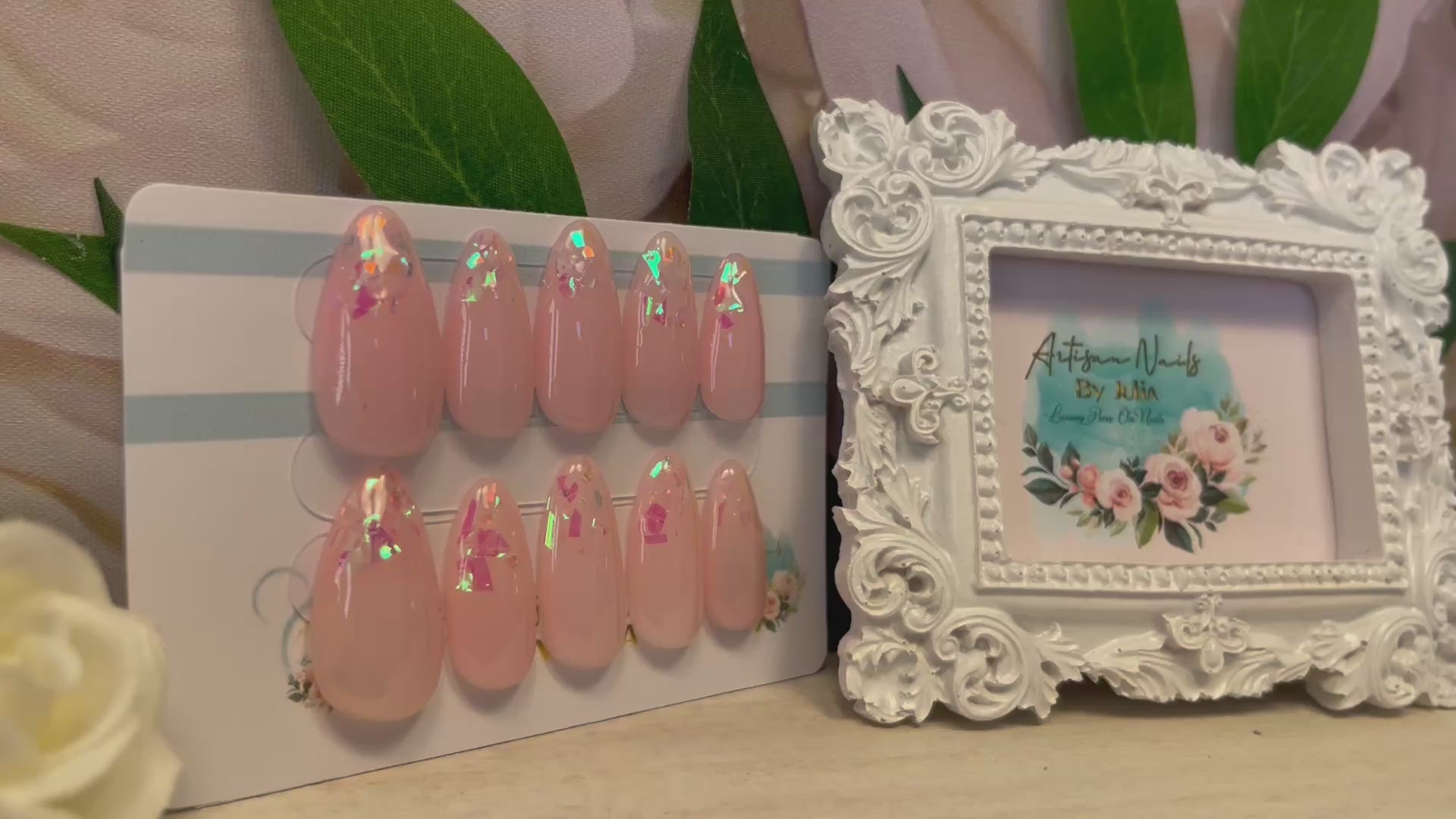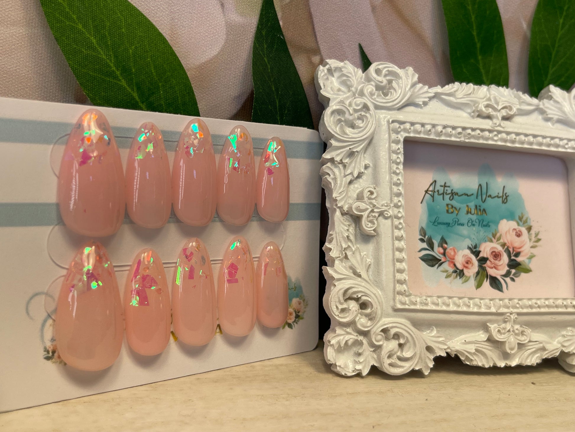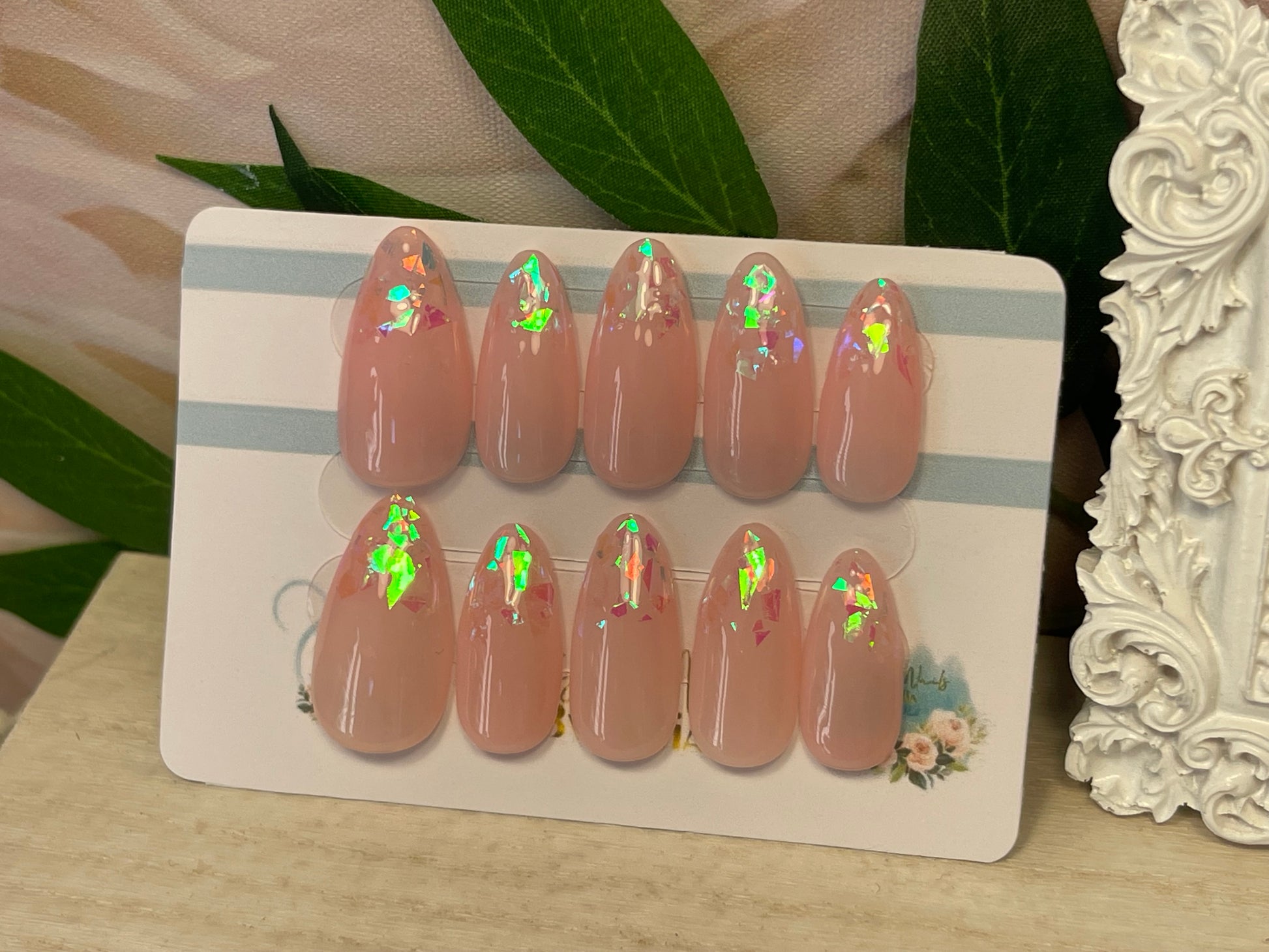 SUNSET SHARDS - Juego de 10 uñas de gel rosa con puntas de fragmentos de ópalo