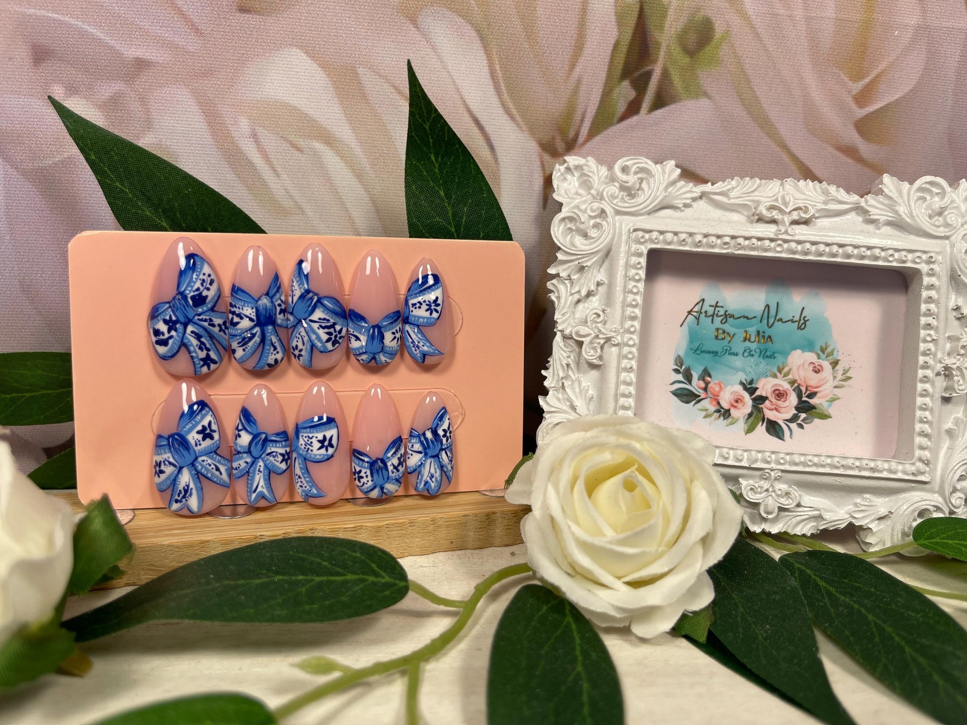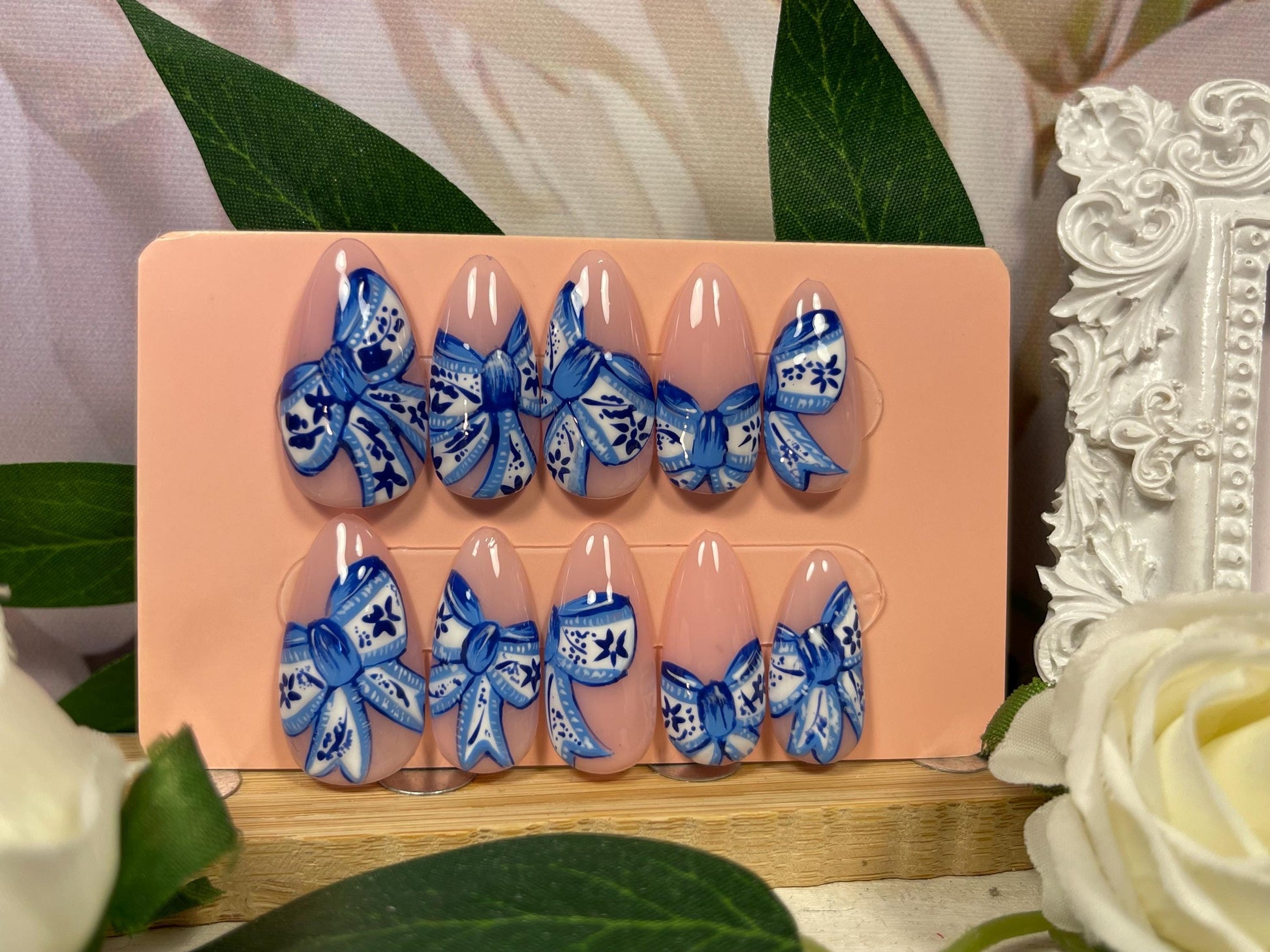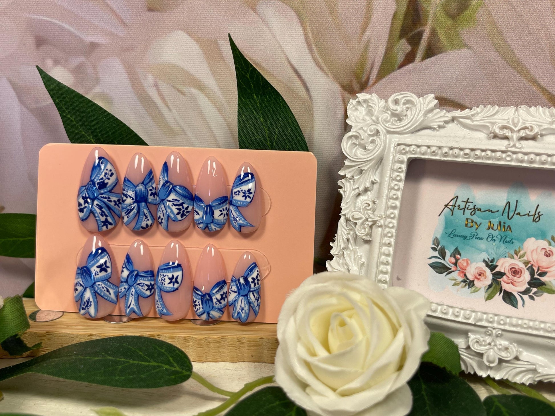 TIE A RIBBON - Uñas postizas de gel - Juego de 10 uñas con lazo floral azul