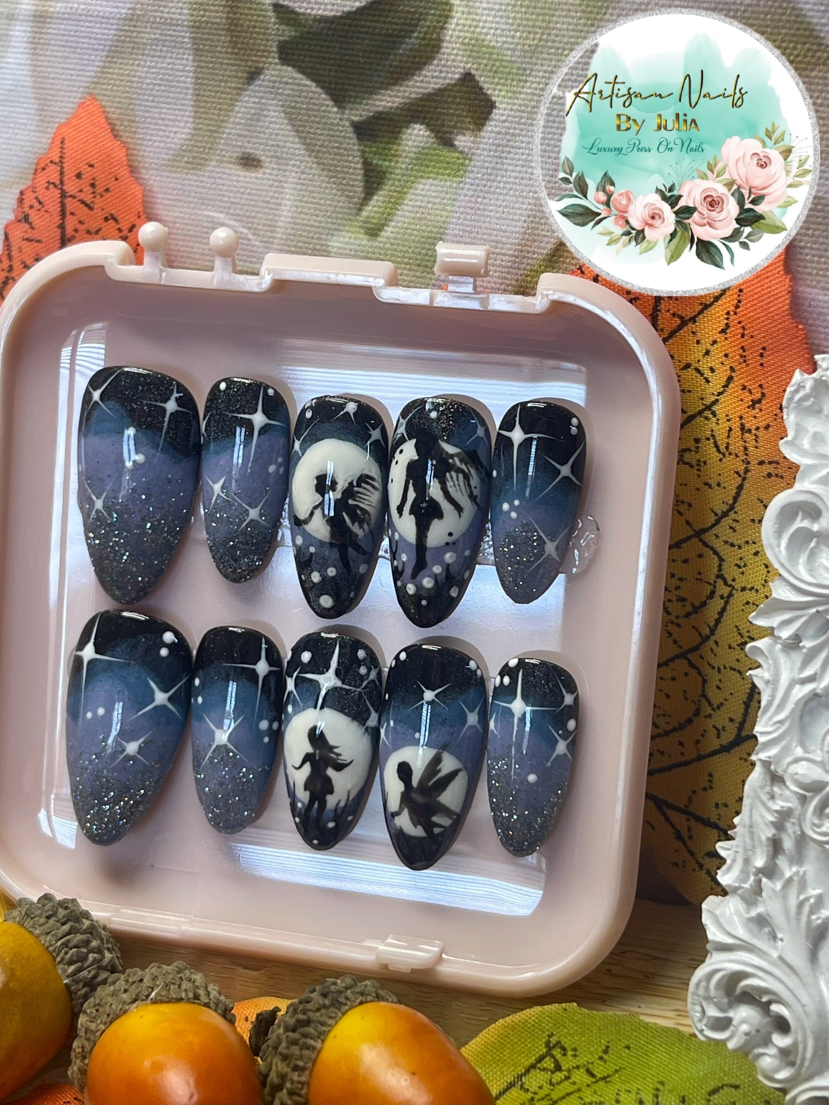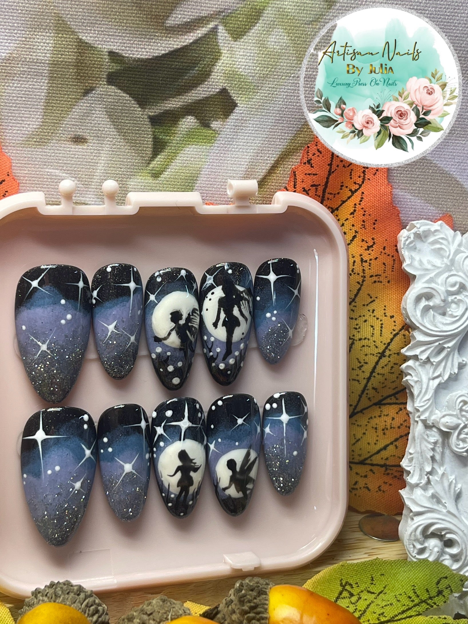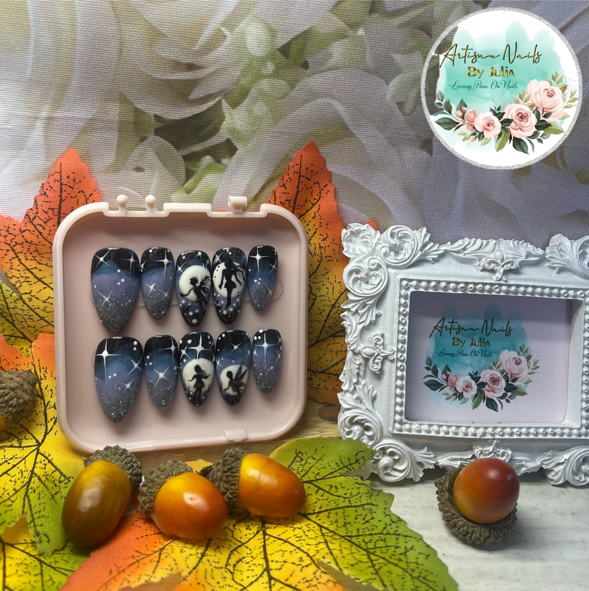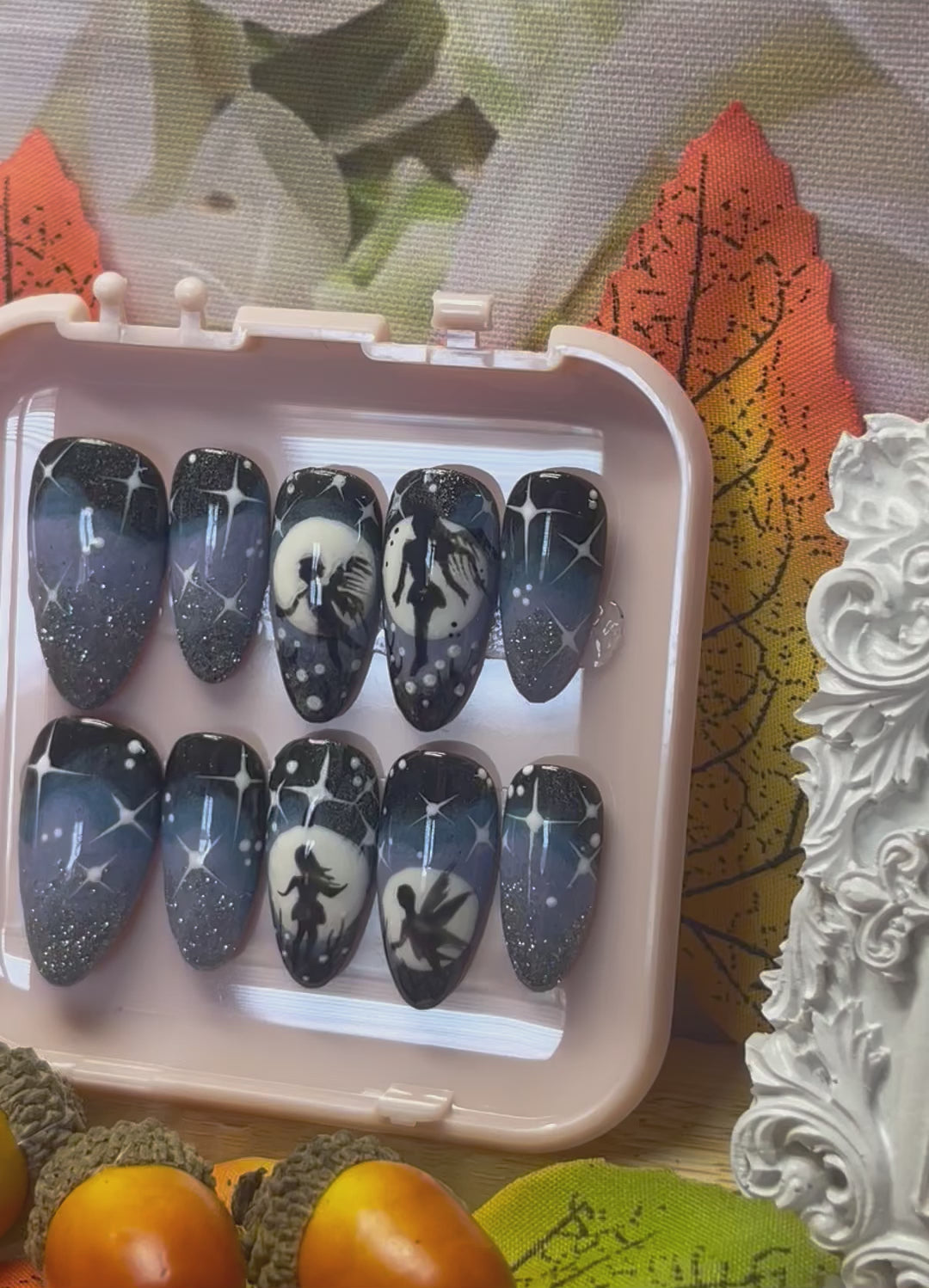 TWILIGHT - Uñas de gel prensadas - Set de 10 uñas de medianoche con detalles de hadas