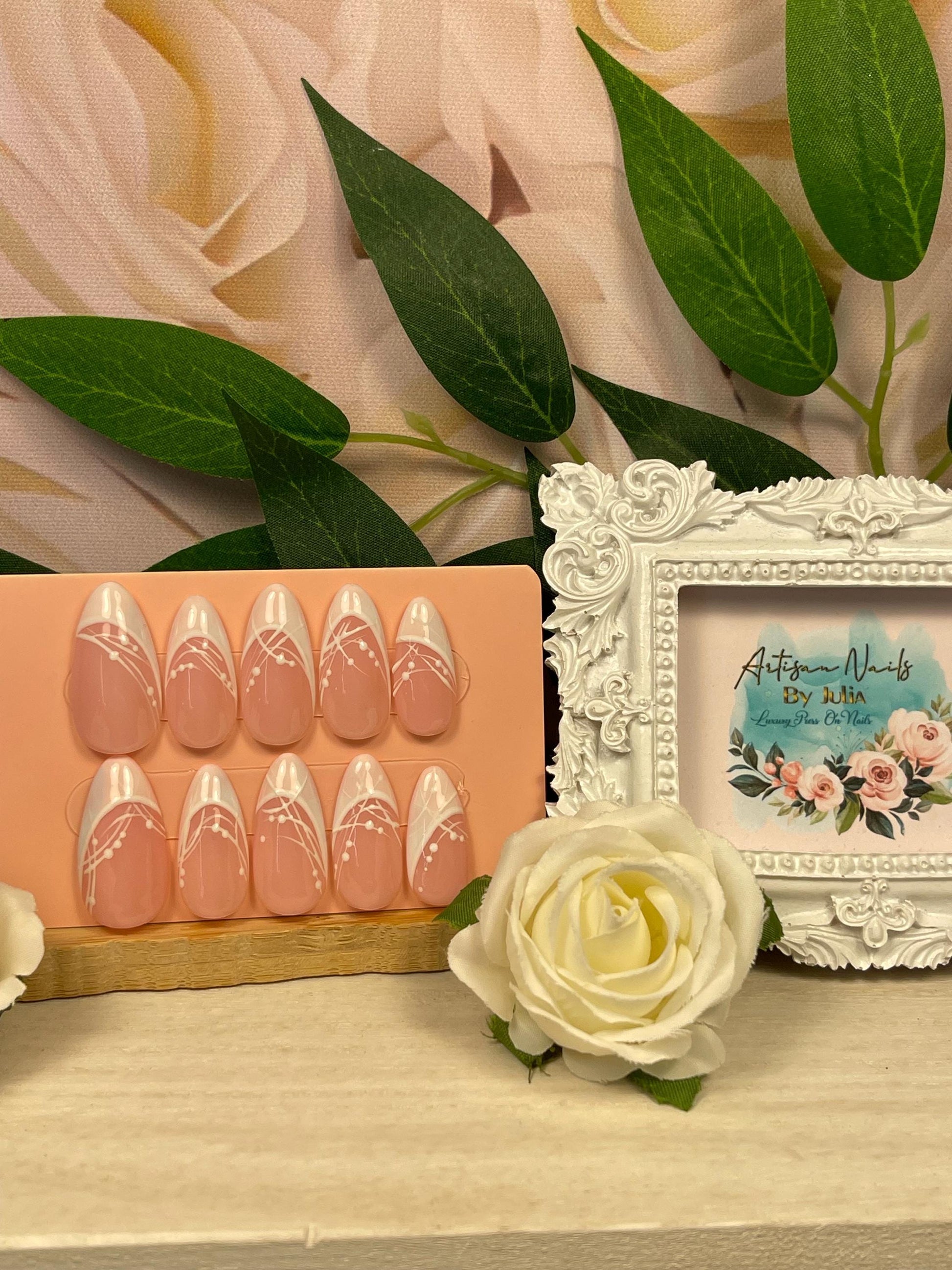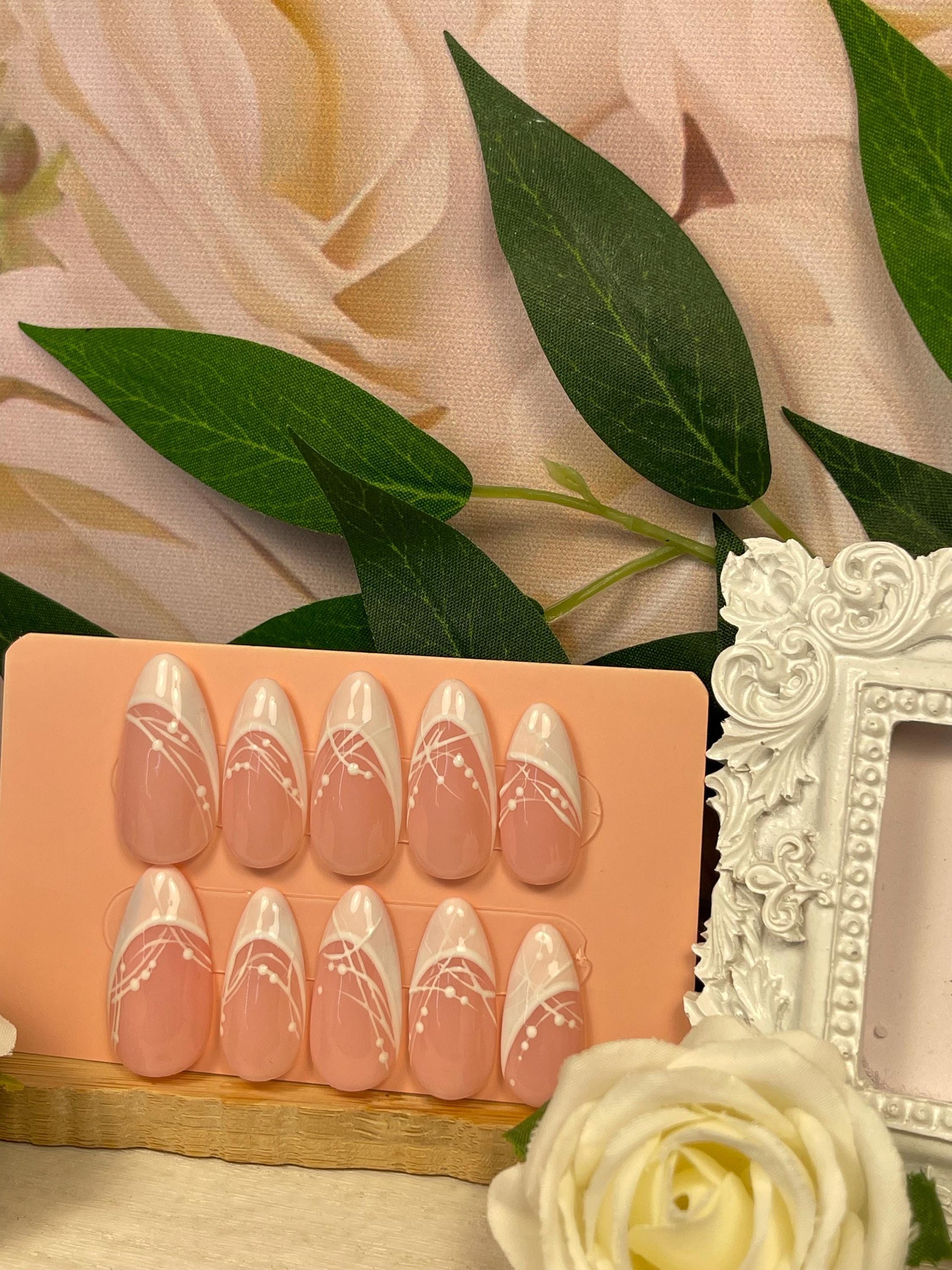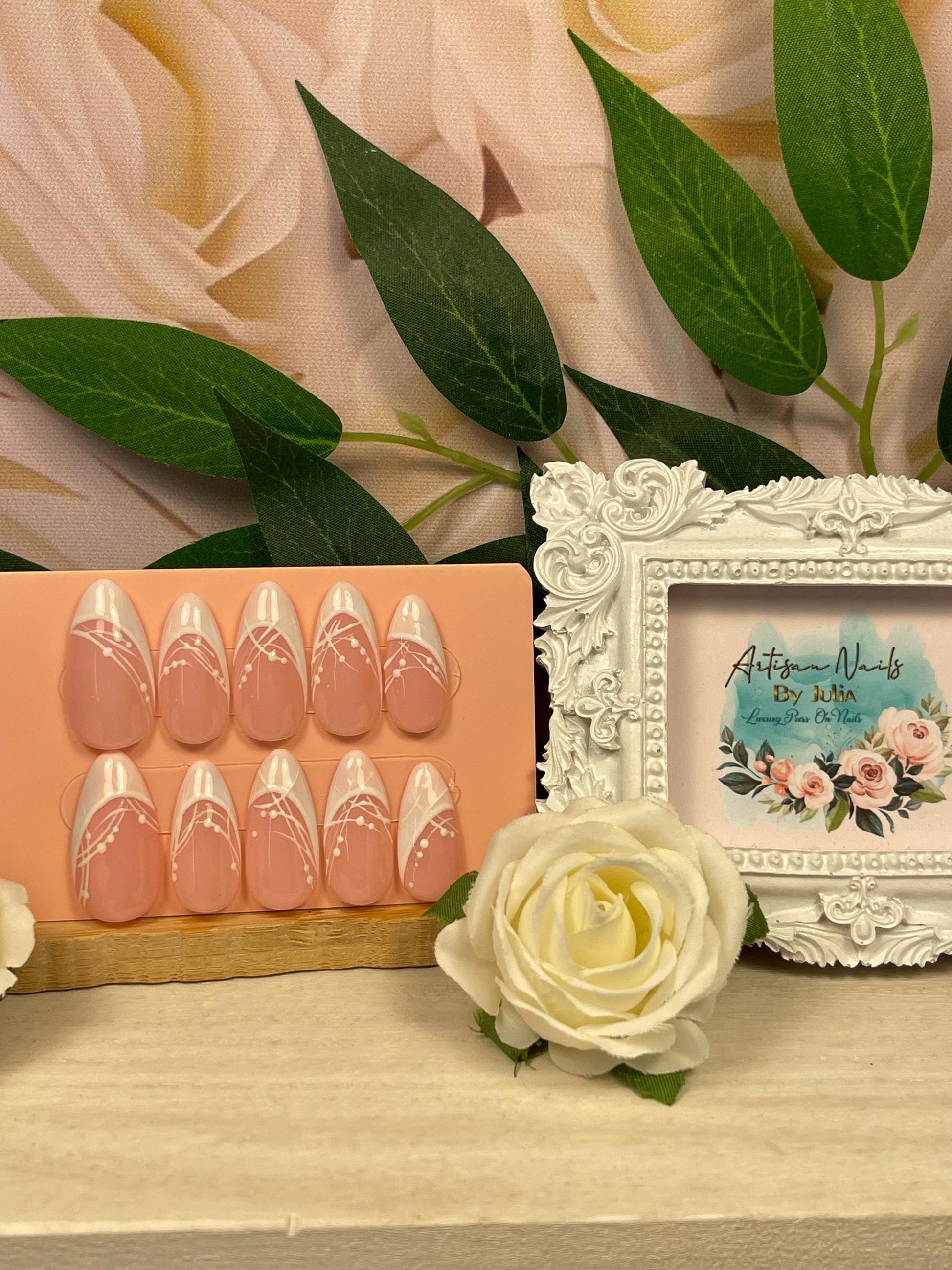 Light pink & light blue French tips, fine cross cross fine line details with tiny dots. A great set for a French tip alternative