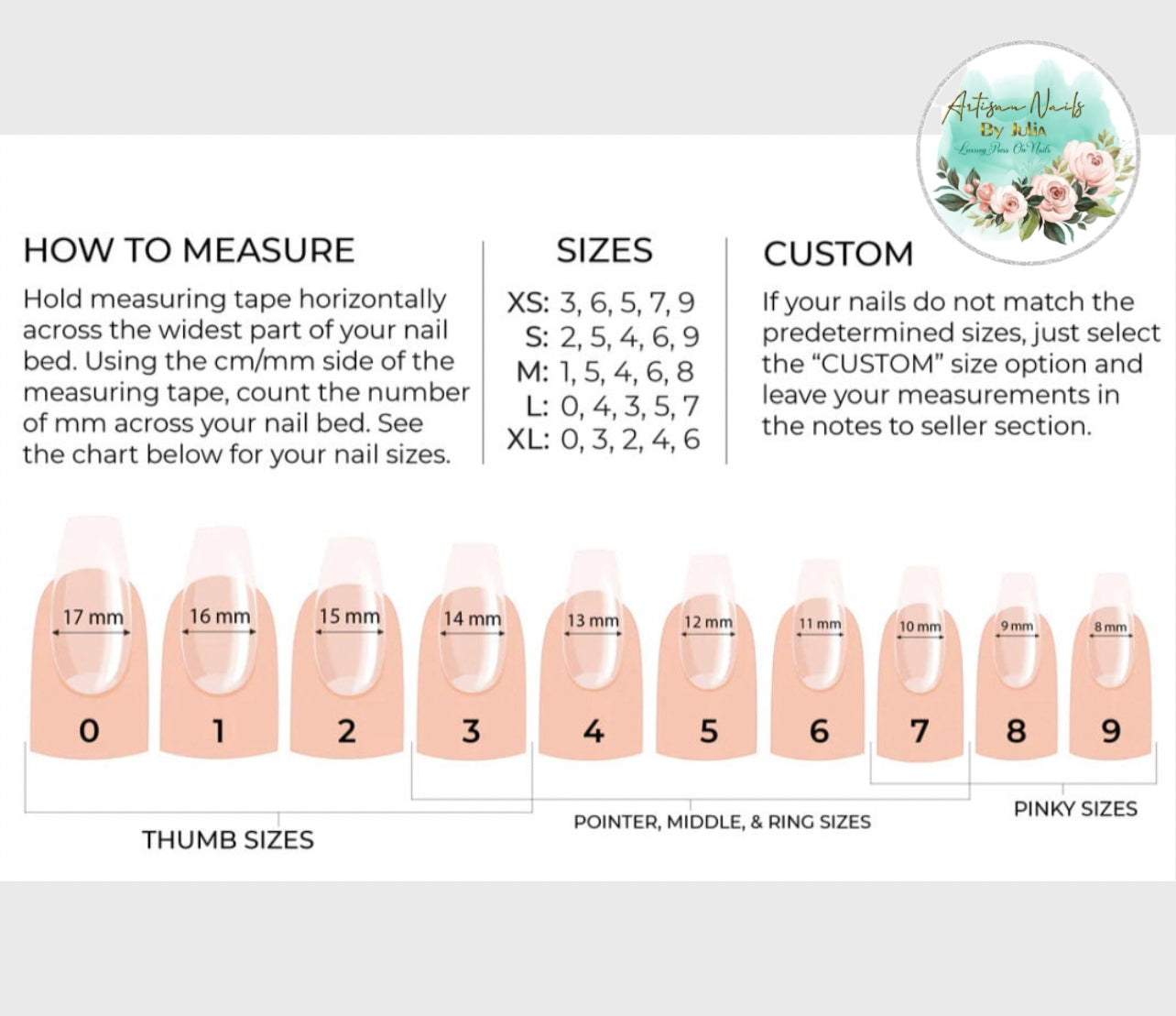 🌿 Attention : Nous n'acceptons pas les retours, car nos ongles sont fabriqués sur commande. Pour des raisons d'hygiène, veuillez donc mesurer vos ongles. Artisan Nails décline toute responsabilité si les ongles ne s'ajustent pas correctement en raison d'une mesure incorrecte.
