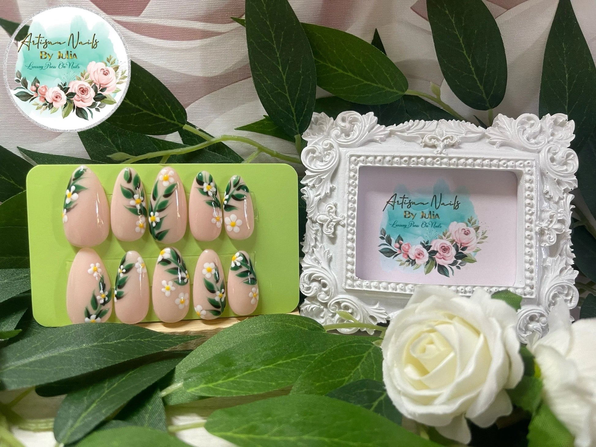 EDELWEISS - Gel Press on Nails - Lot de 10 faux ongles à motif floral - Fabriqué sur commande