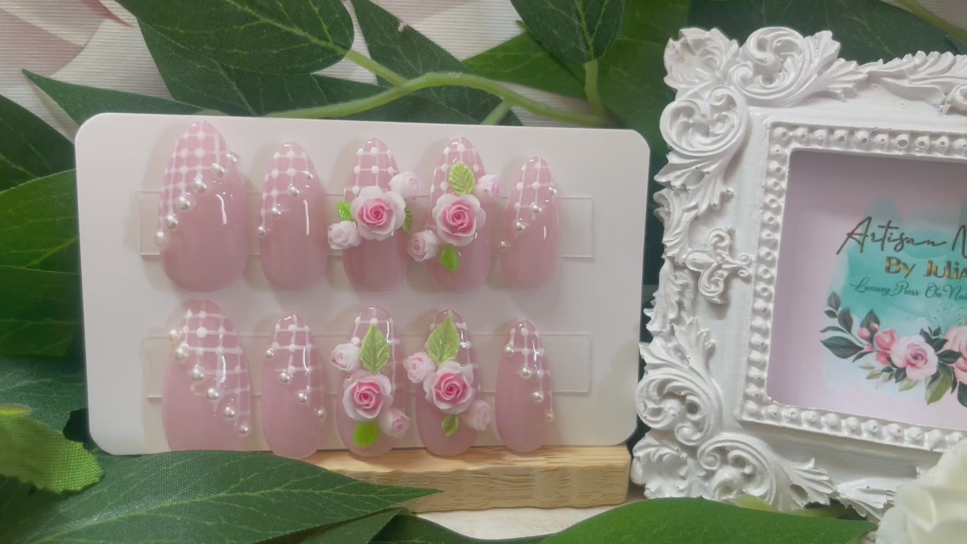 LOVE STORY - Gel Press on Nails - Lot de 10 faux ongles en dentelle avec roses 3D - Fabriqués sur commande