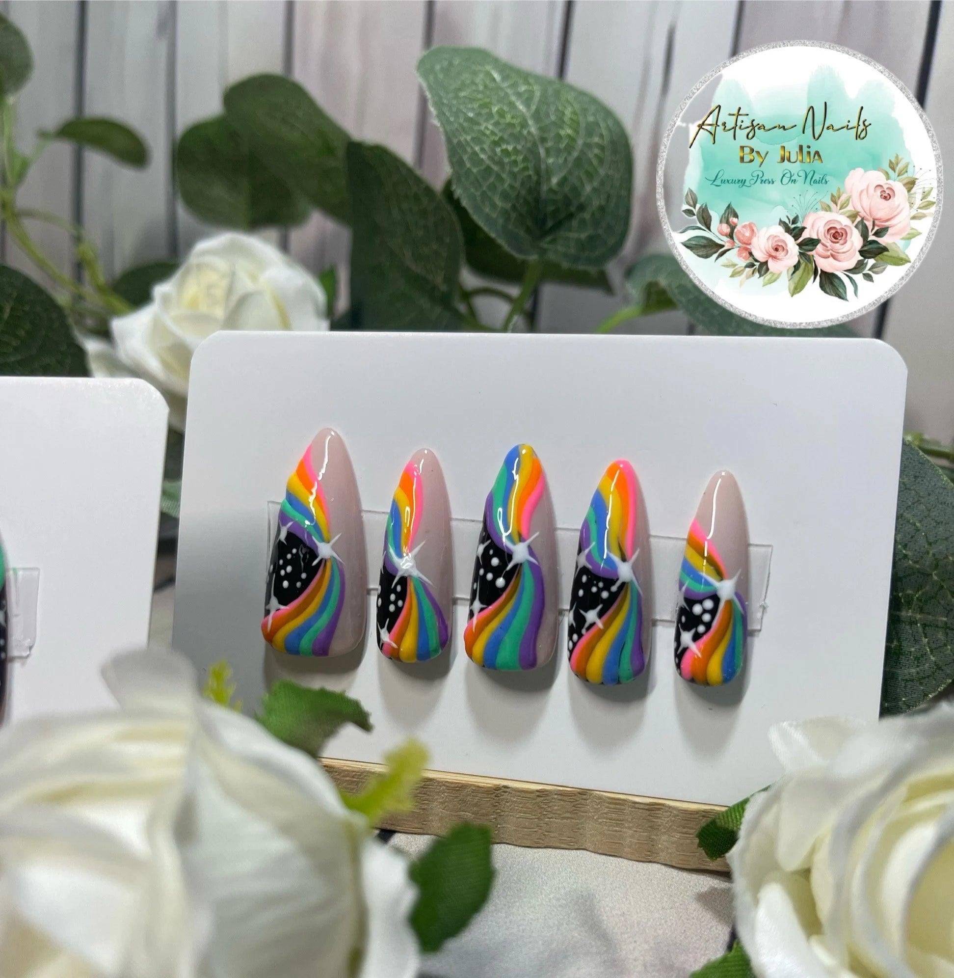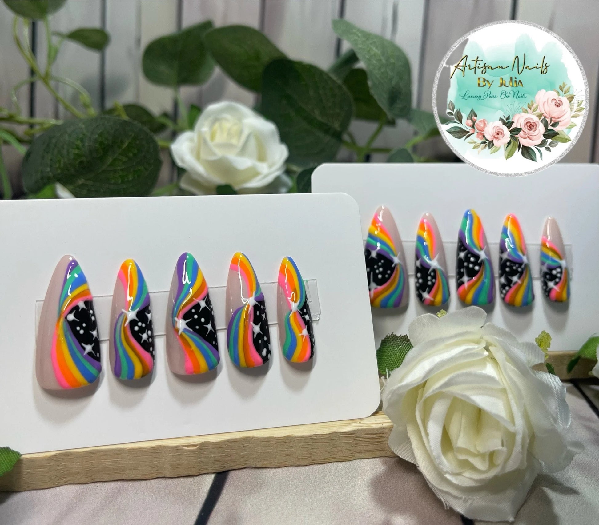 SHOW STOPPER - Ongles en gel à presser - Lot de 10 ongles noirs et arc-en-ciel avec étoiles - Fabriqués sur commande