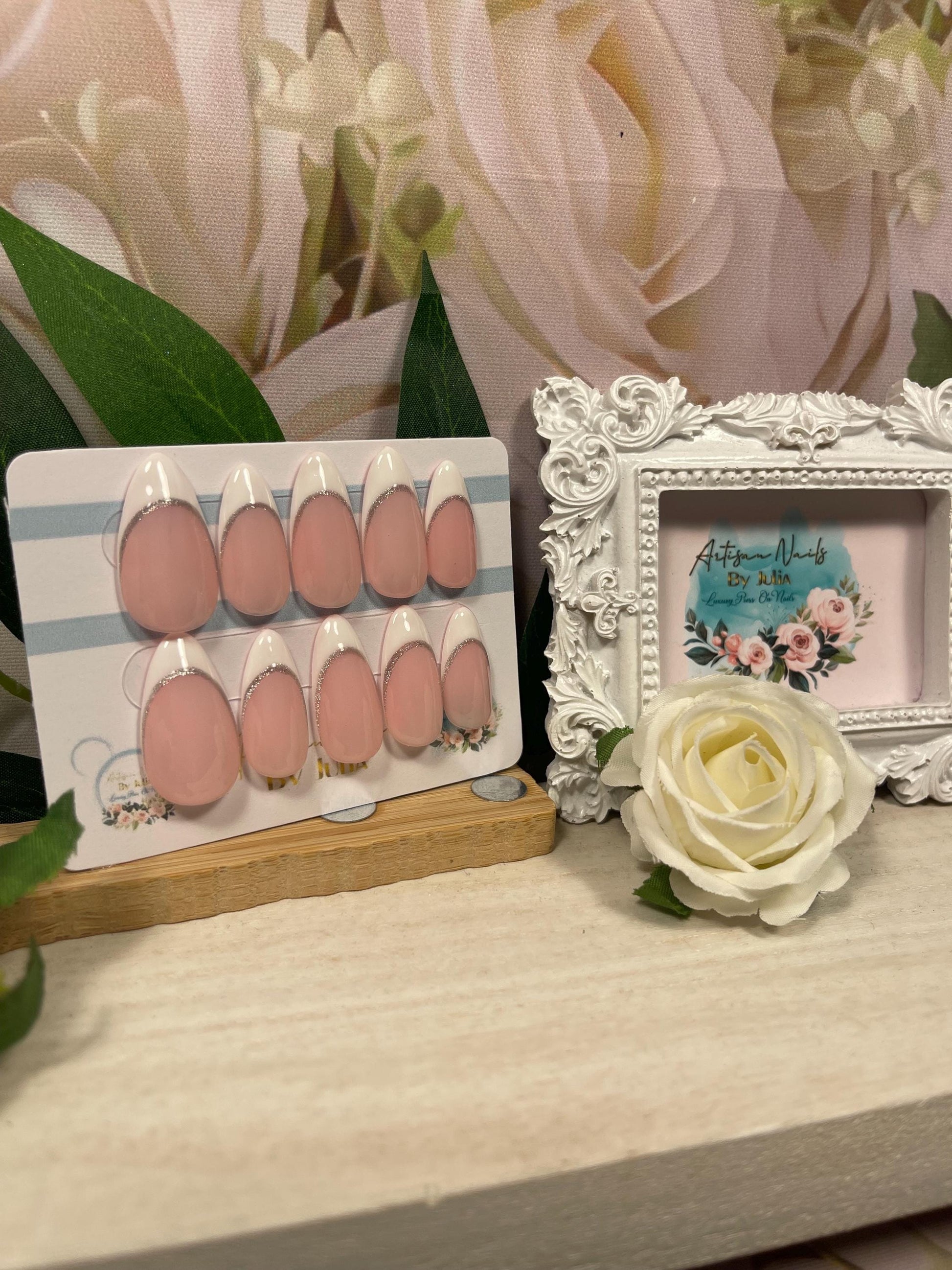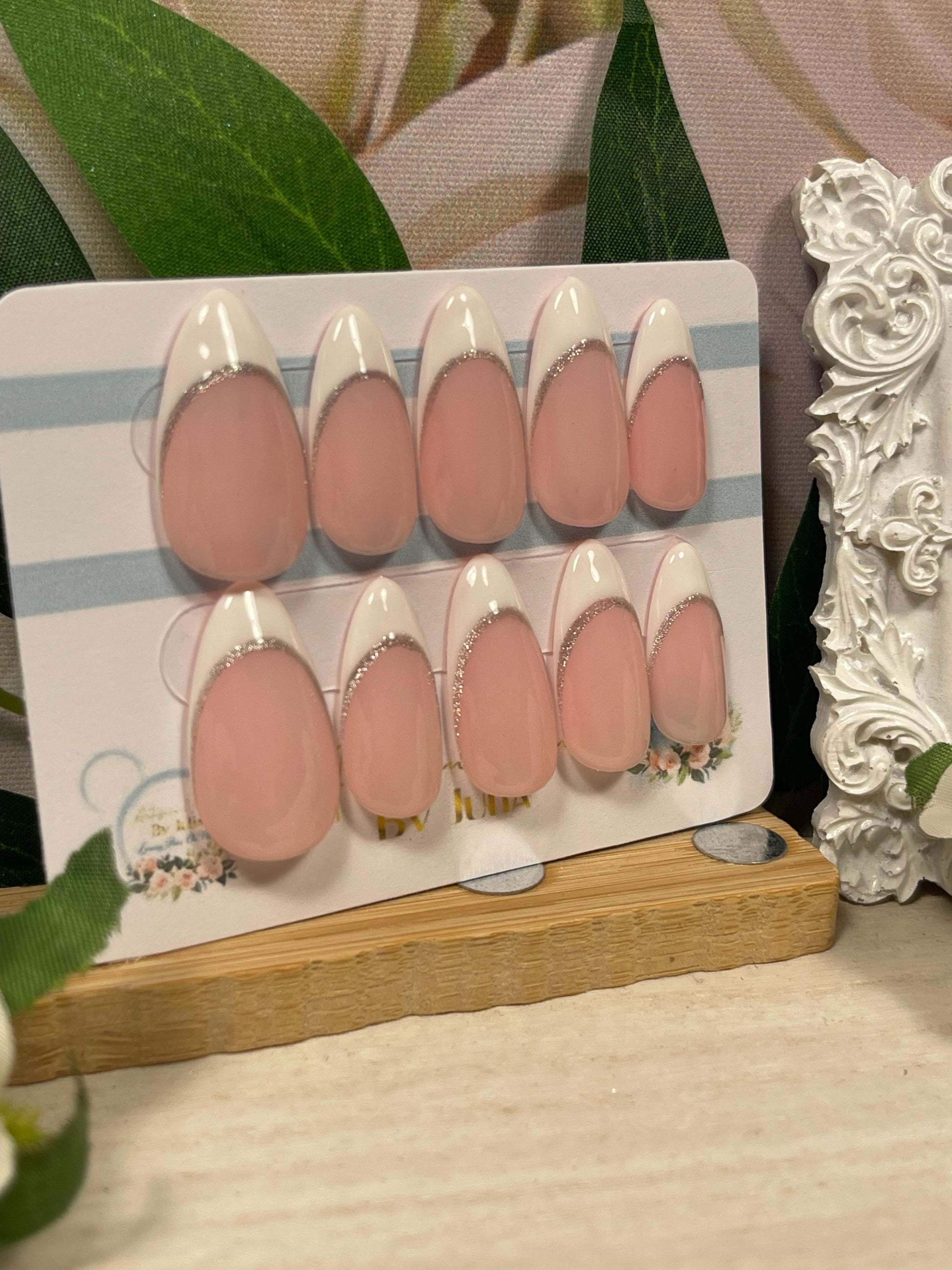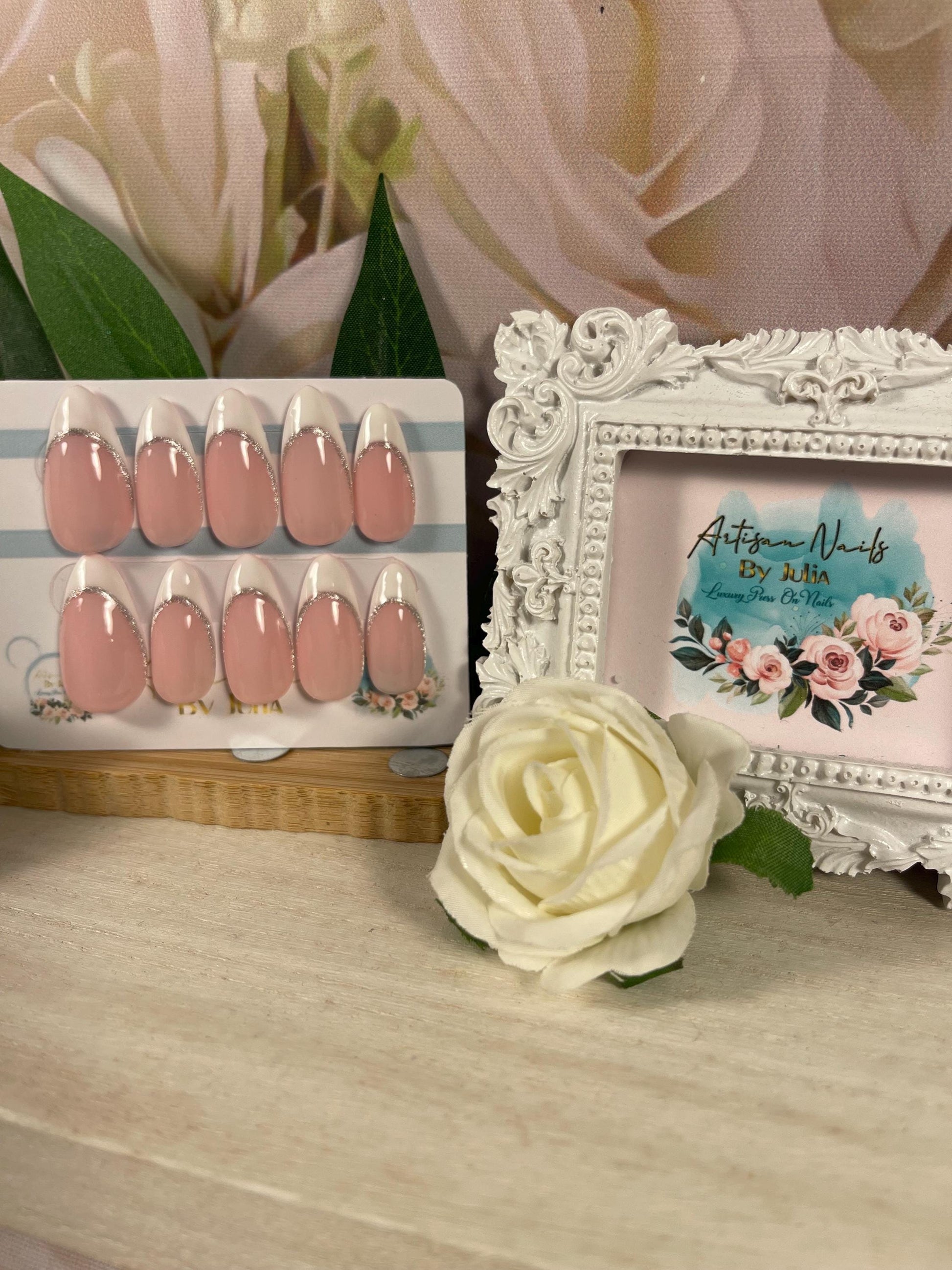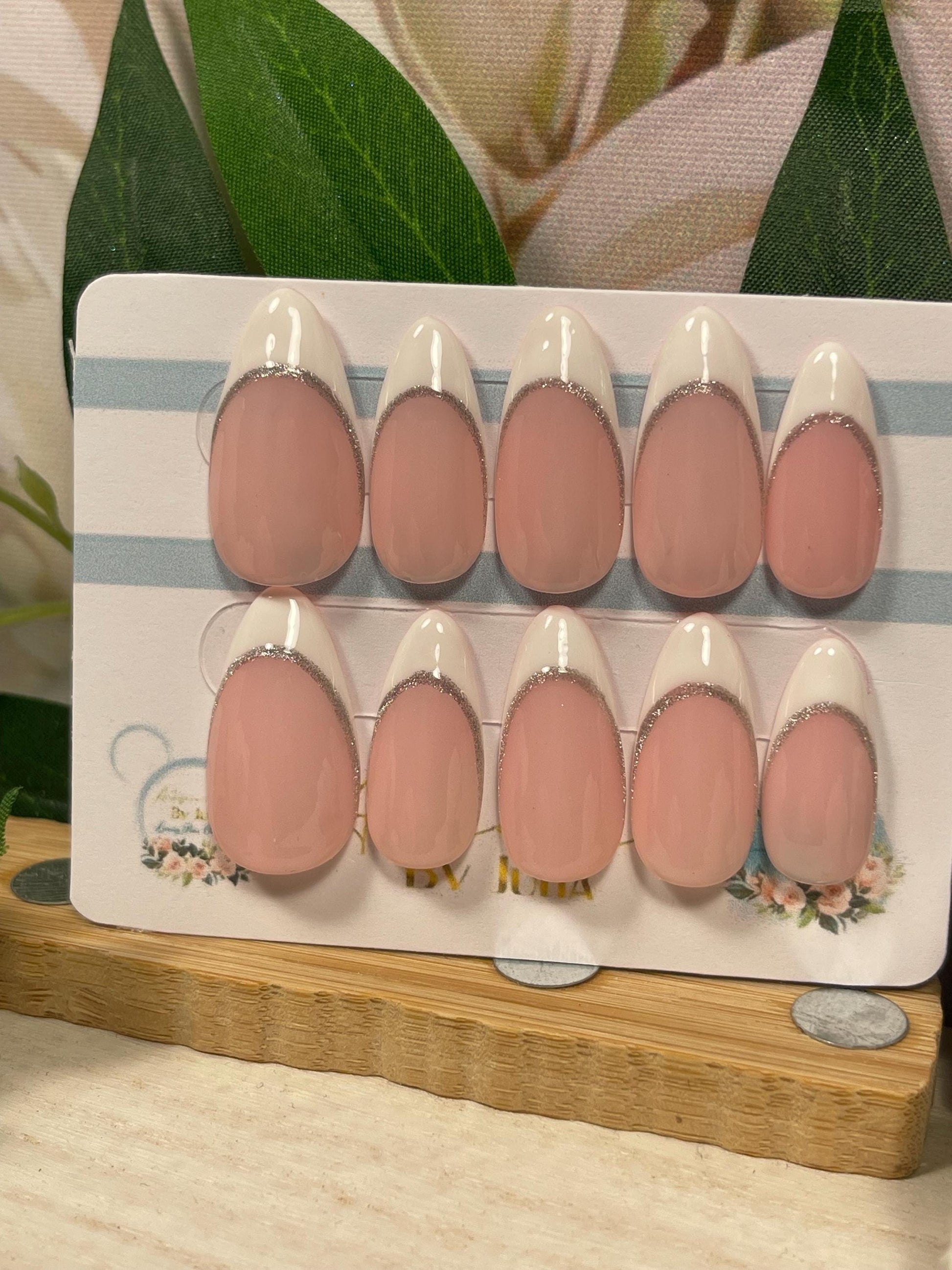 SILVER LADY - Set of 10 Classic French Tip Nails with Silver Sparkle line