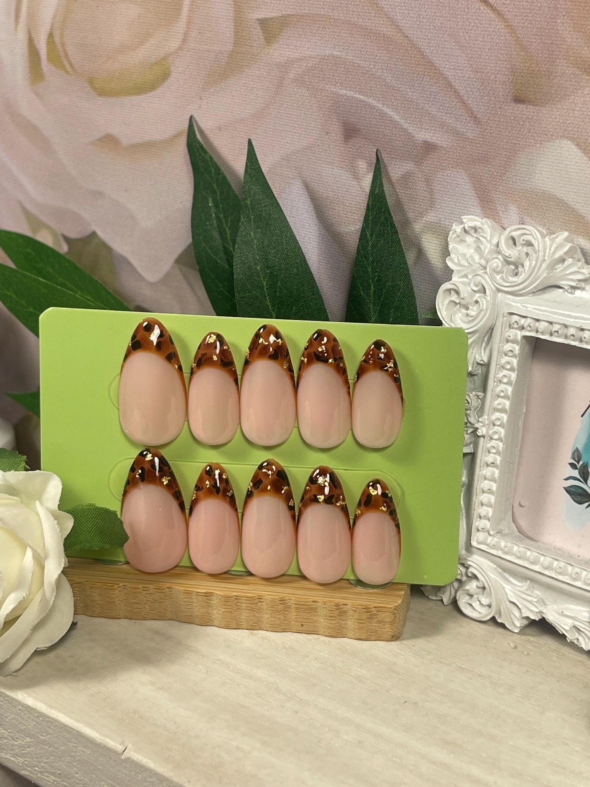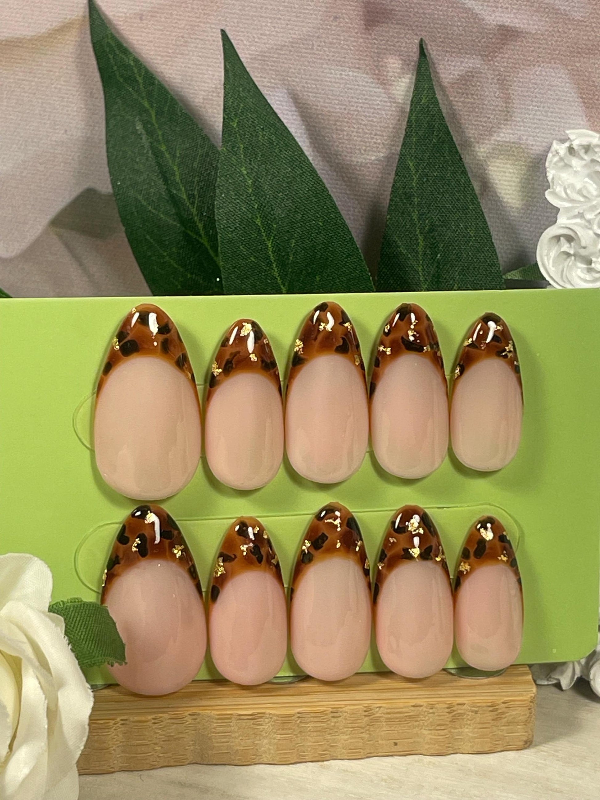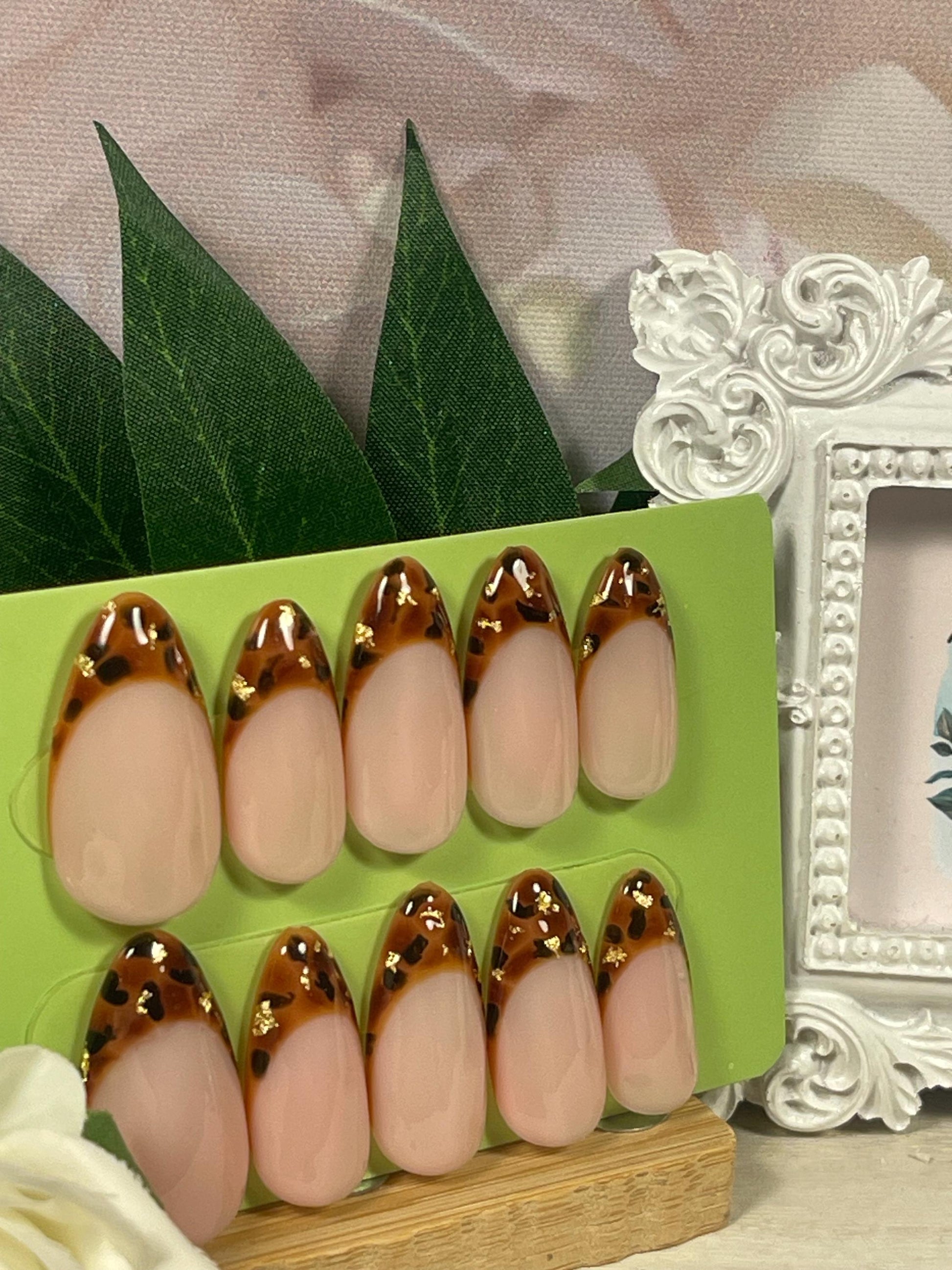 TORTOISE GOLD - Set of 10 Tortoise shell Gold leaf French Tip Nails