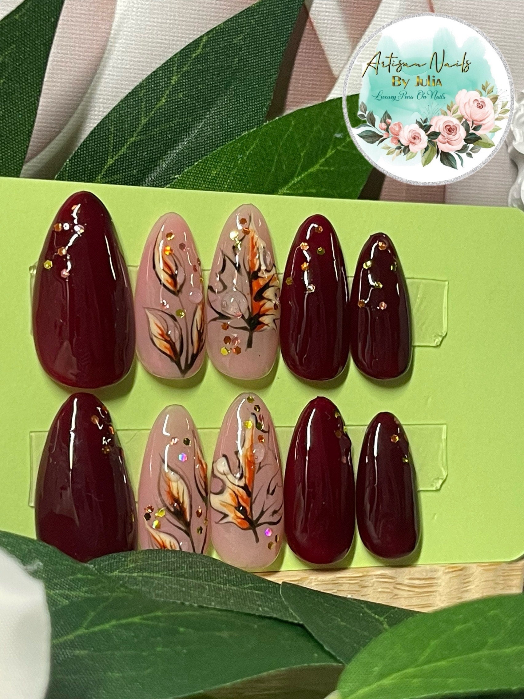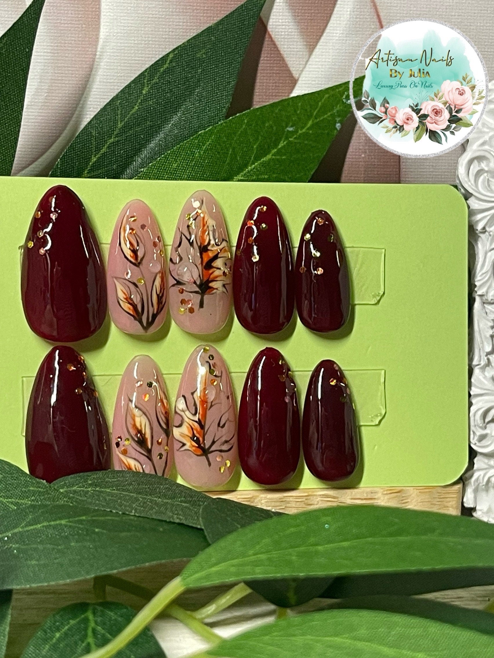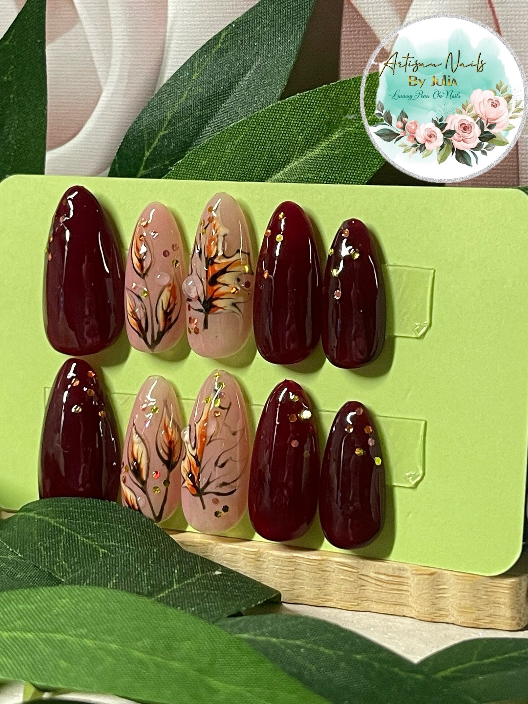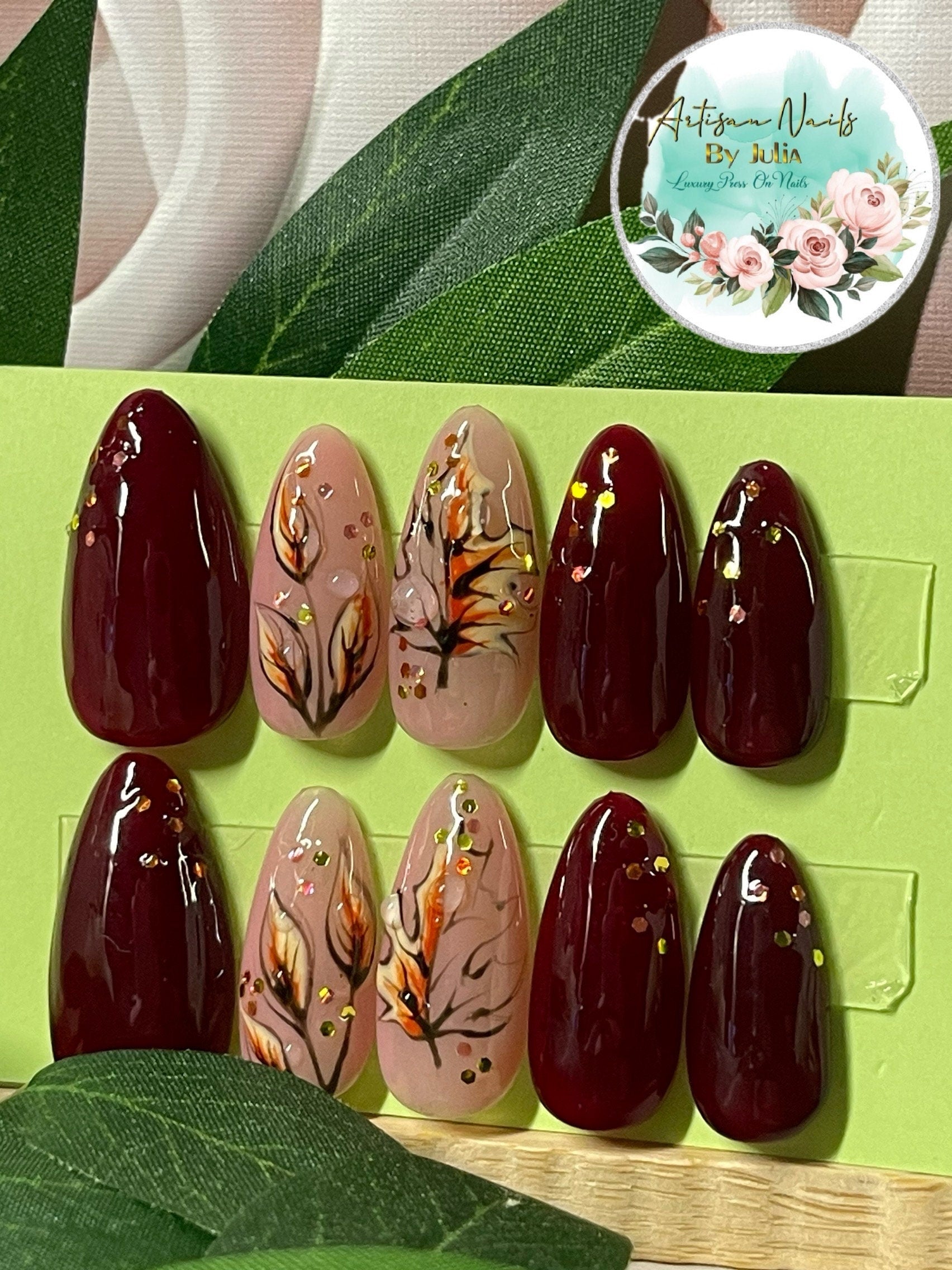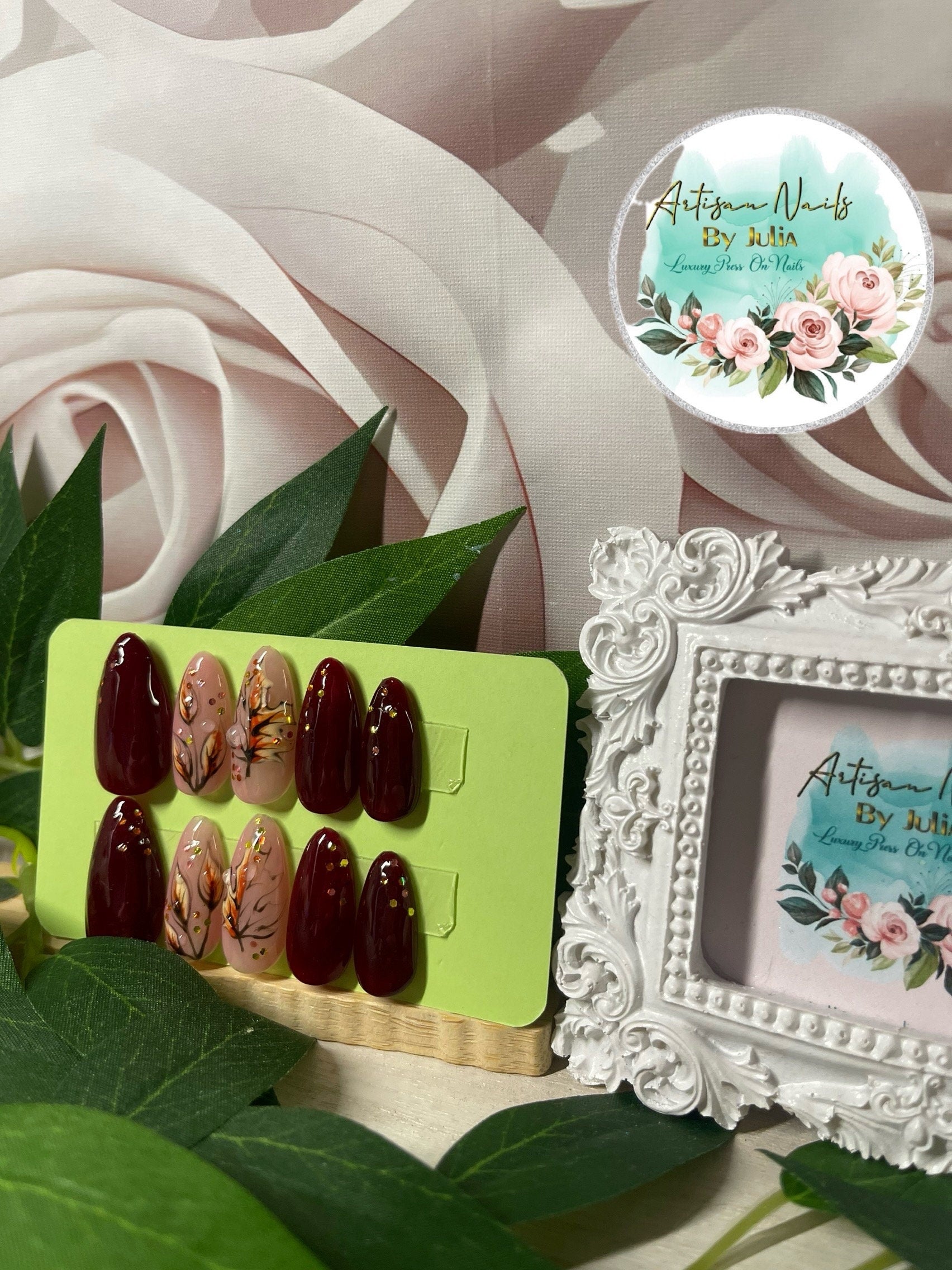 AUTUMN FIRE - Set of 10 autumn leaf and deep red Nails with 3D dew drops.