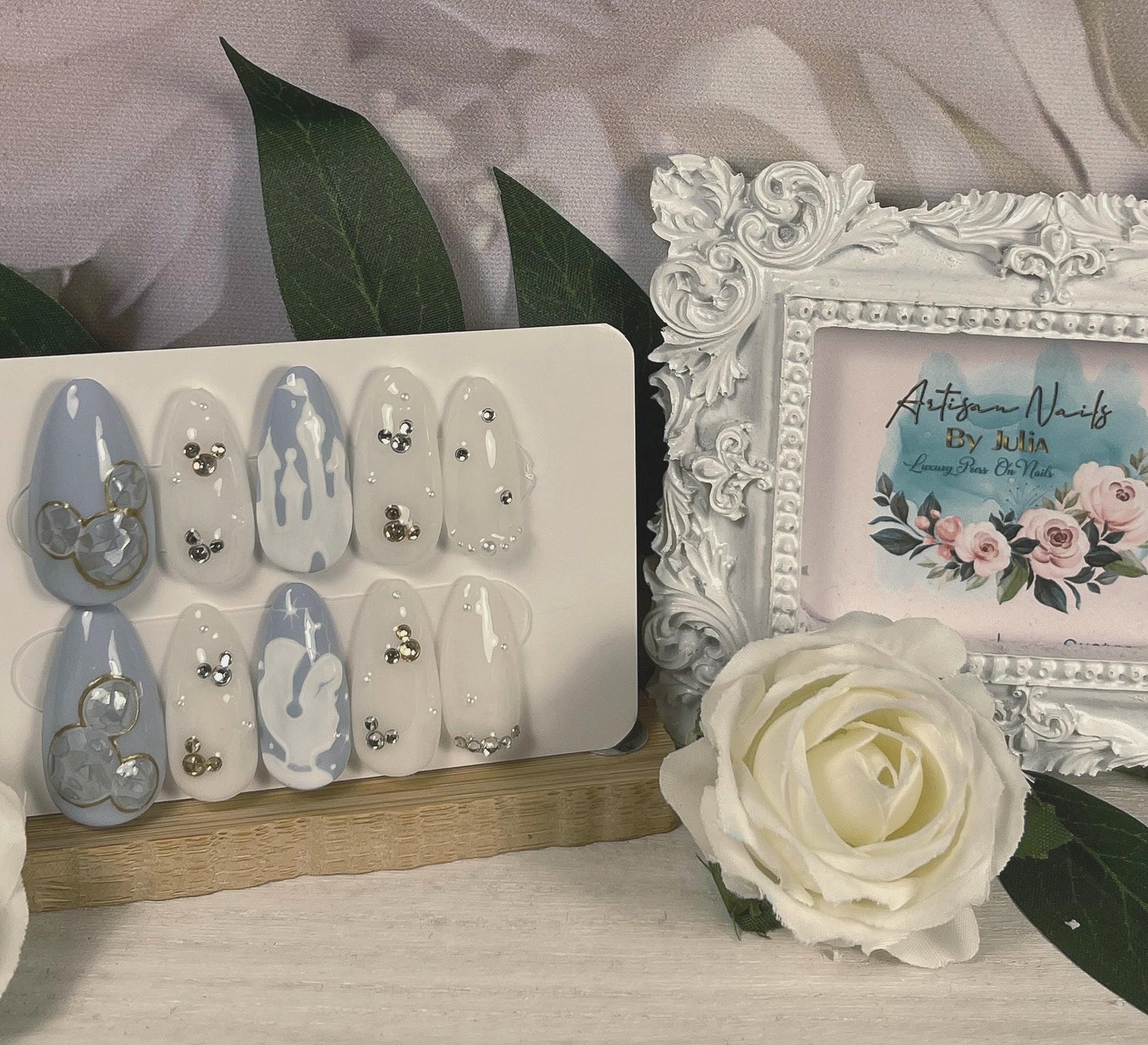 Blue and Milky white nails, Mickey had diamanté arrangements and mother of pearl statement thumb design. Cinderella cameo and castle silhouette.