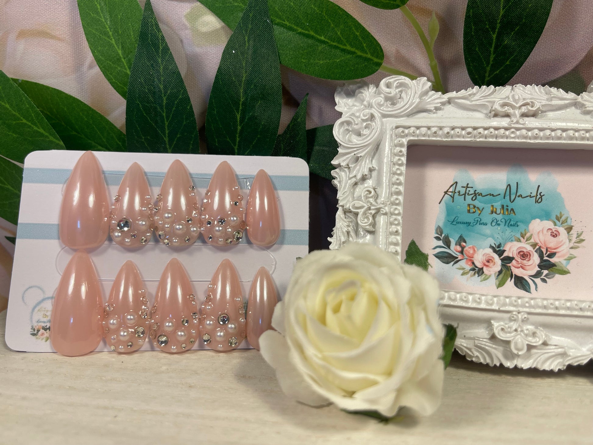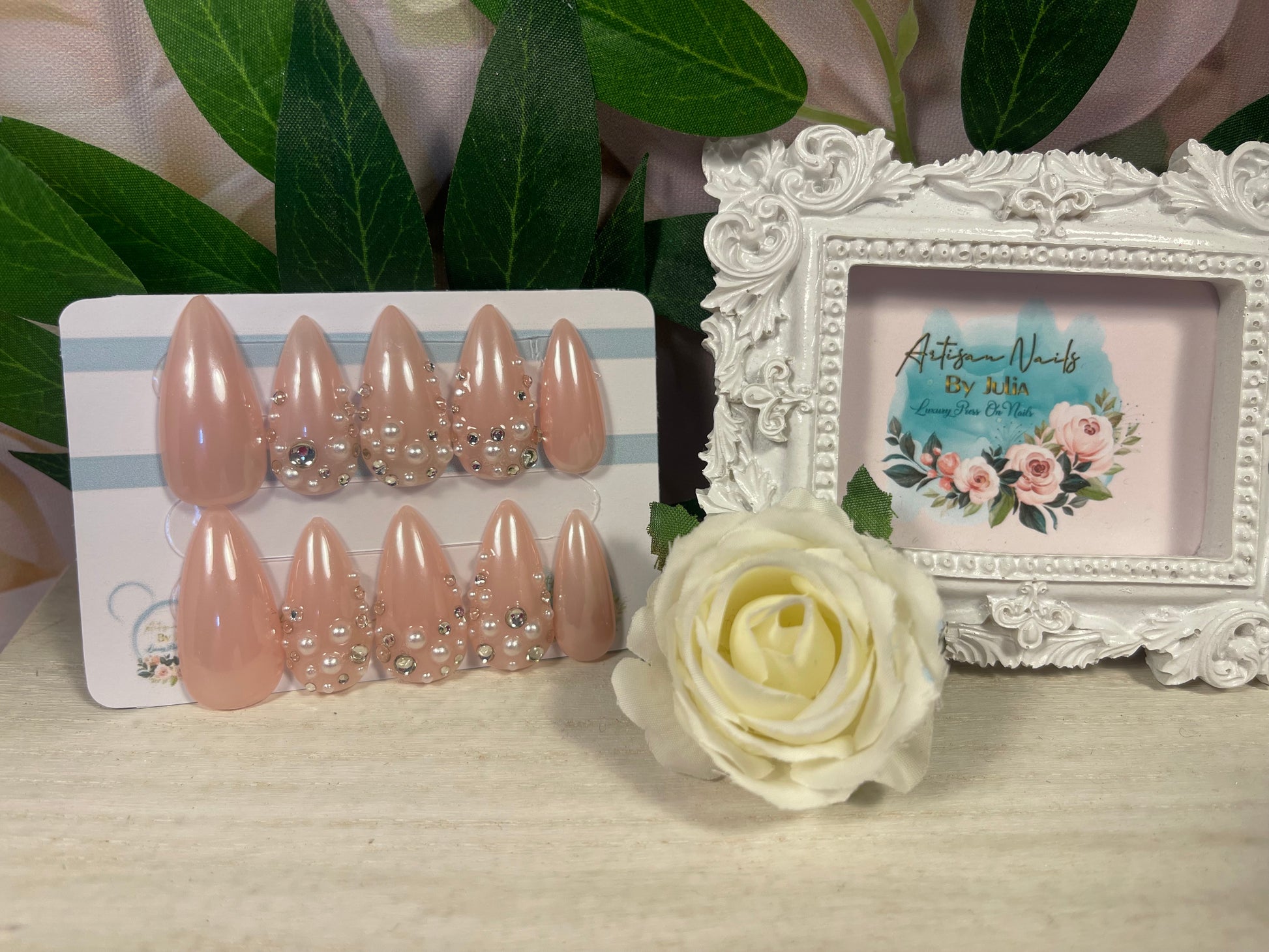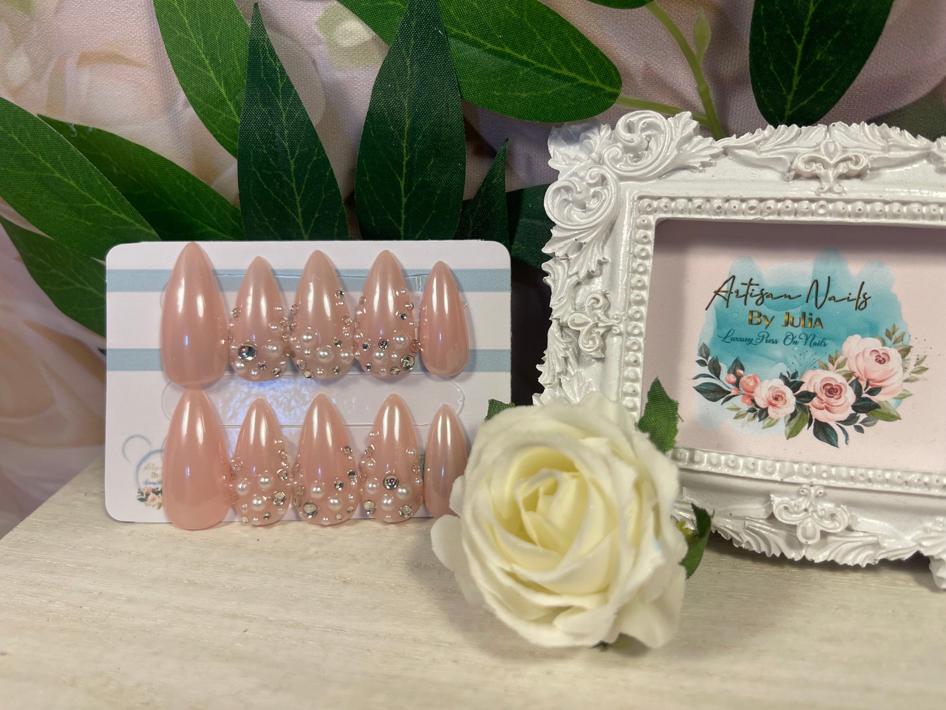 Perfectly Toned Pink Gel with a pearl glazed overlay, adorned with Diamond and Pearl decoration. A sparkly spin for your wedding day.