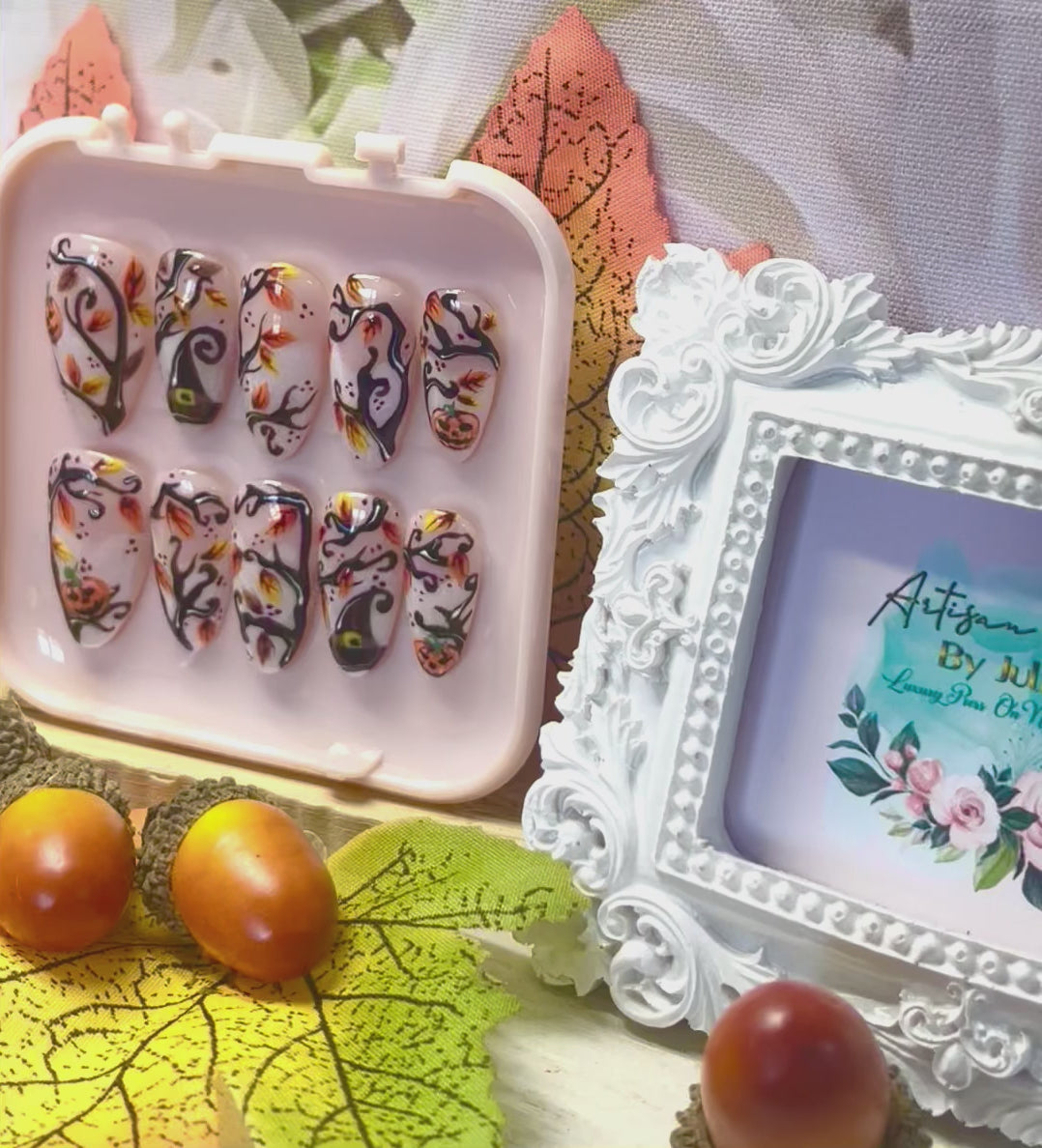 TRICK OR TREAT - Gel Press on Nails - Set of 10 Pumpkin Wood Nails - Made to Order